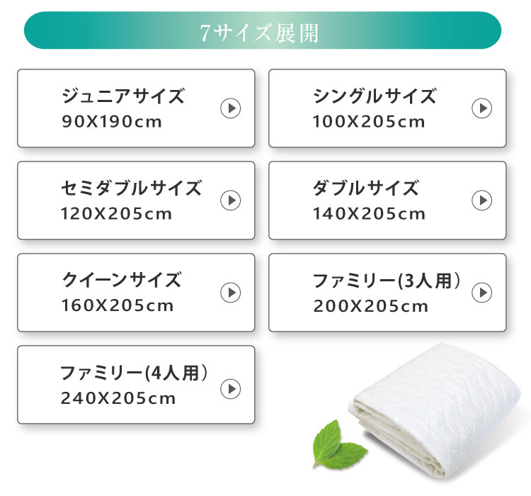 シングル、セミダブル、ダブル、クイーンなどのサイズはもちろんのこと、他店では取り扱いの少ないベビー、ジュニア、ファミリーサイズなどもご用意しております。