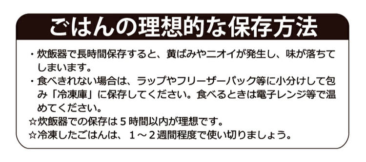 ・長時間の保温は食味の低下やにおい、黄ばみの原因となるので御注意ください。