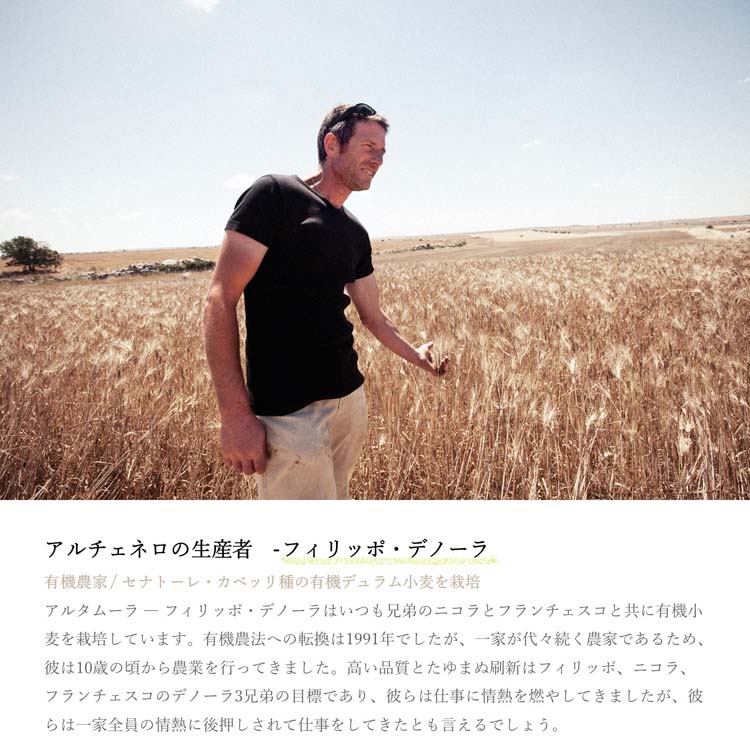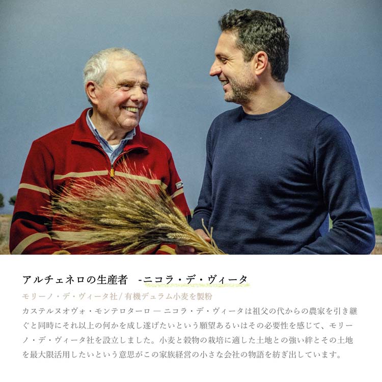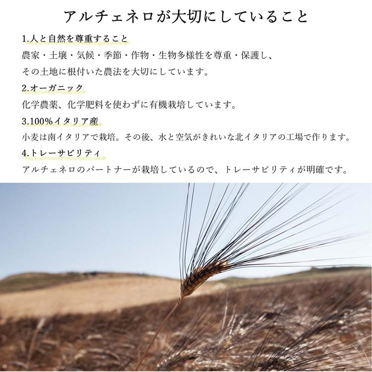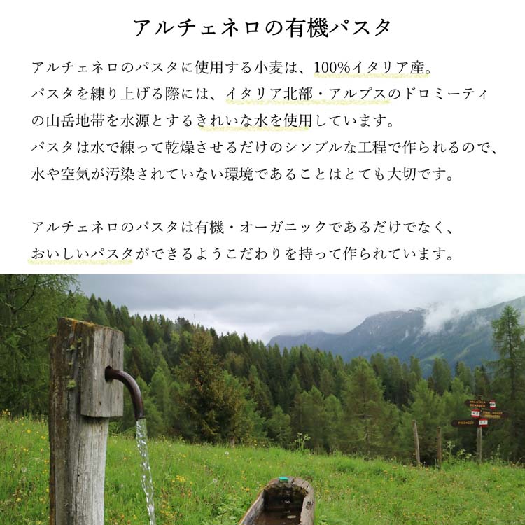 ●アルチェネロの有機パスタは、オーガニック農法で大切に育てられた生産者メンバーの小麦を、美しい山々に囲まれたきれいな水と空気のもと、最適な製法でパスタへと加工しています。そのため、品質の良さ、伝統農法を貫く真摯さに加え小麦の持つおいしさや栄養価が楽しめます。
