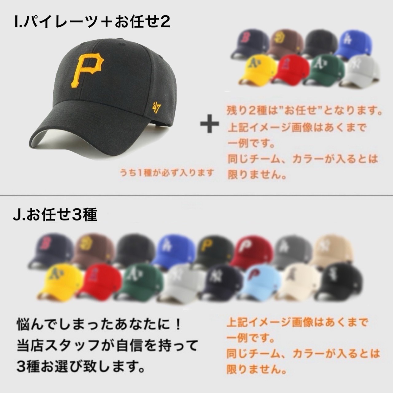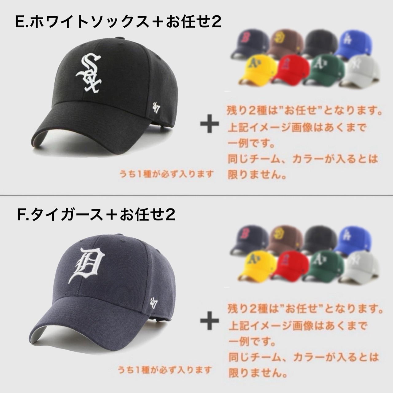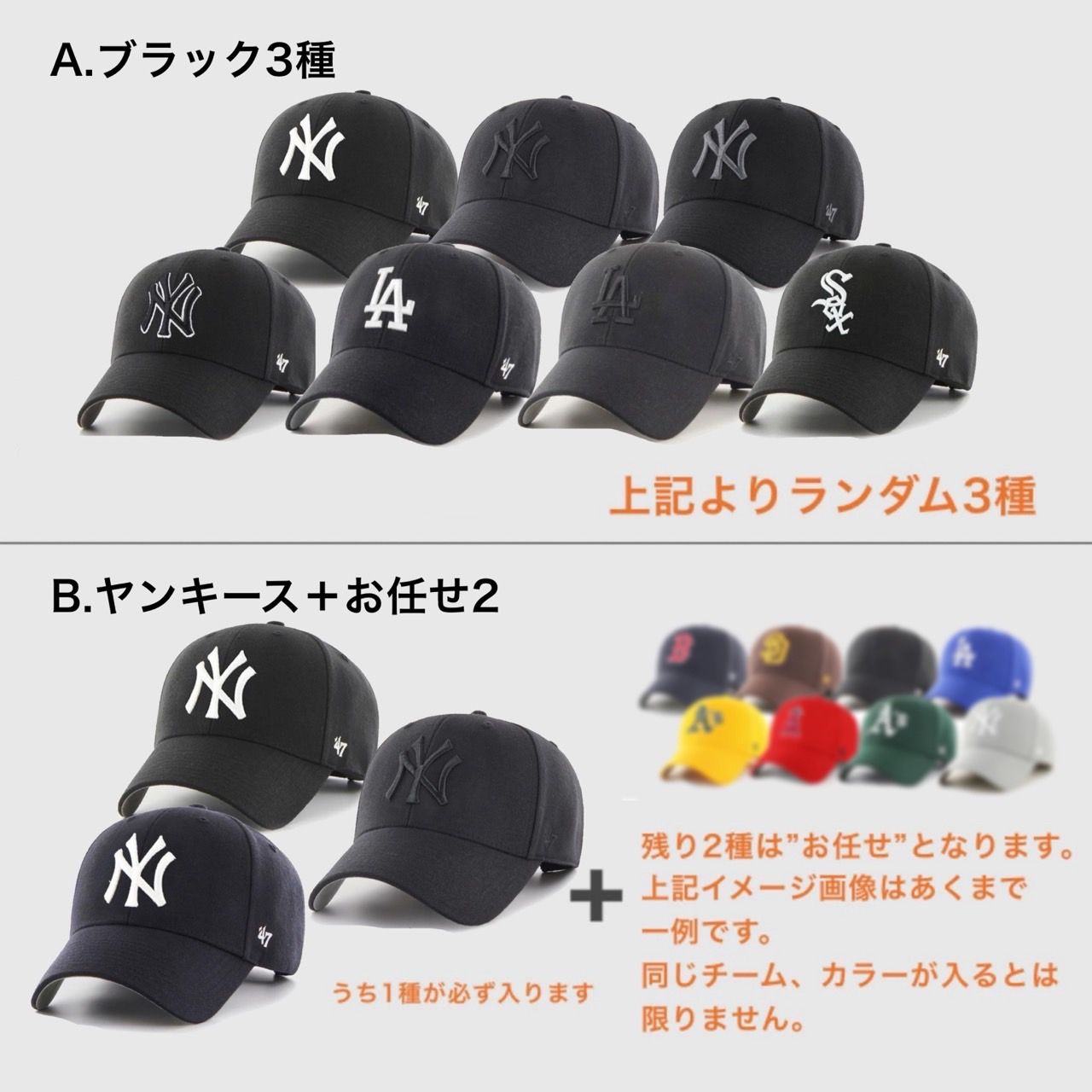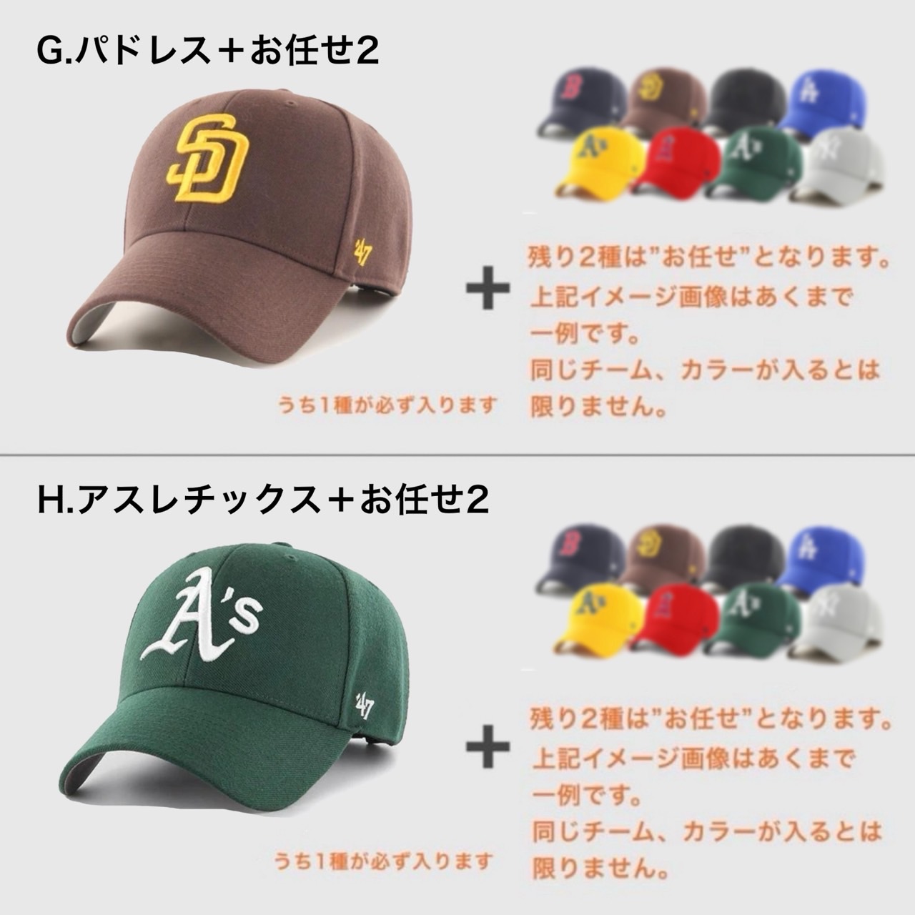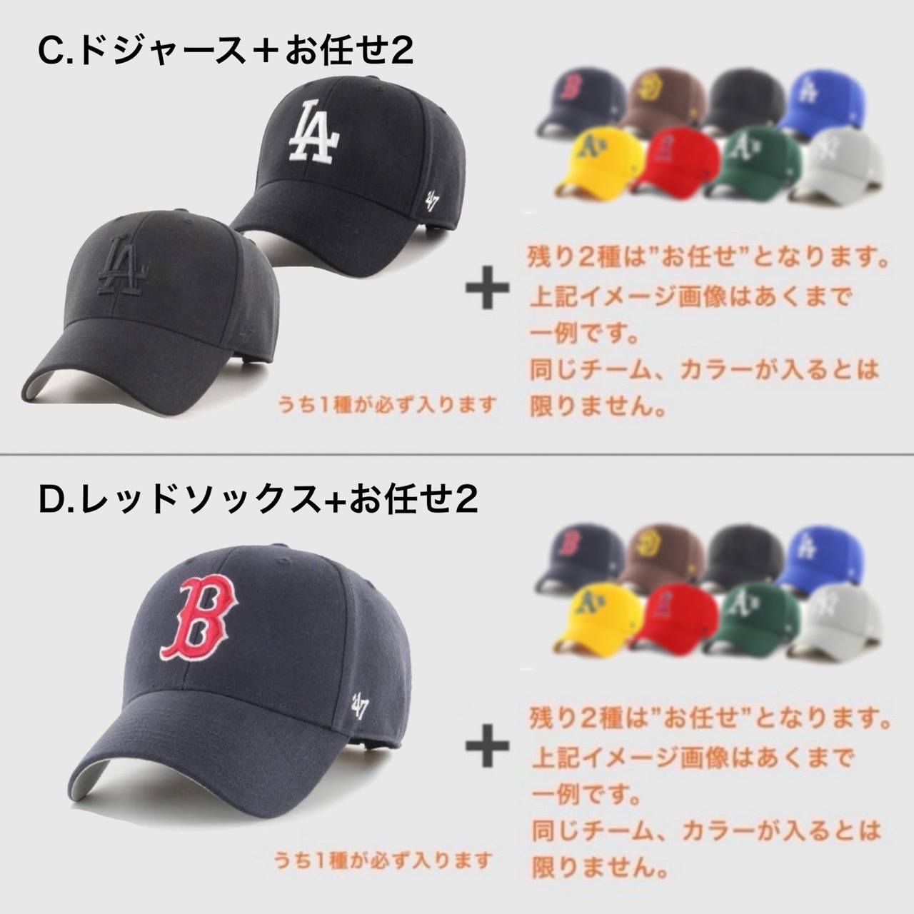 2.『お任せ』枠のキャップについてはカラーやデザインの指定など一切承れません。