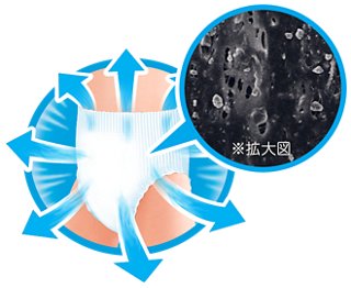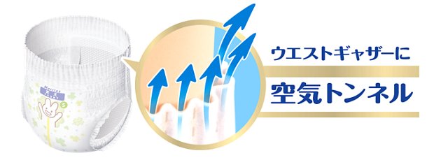 おしりずーっとさらさら。ウエストギャザーに「空気トンネル」。肌とギャザーの間からもムレを追い出す。全面通気性シート。