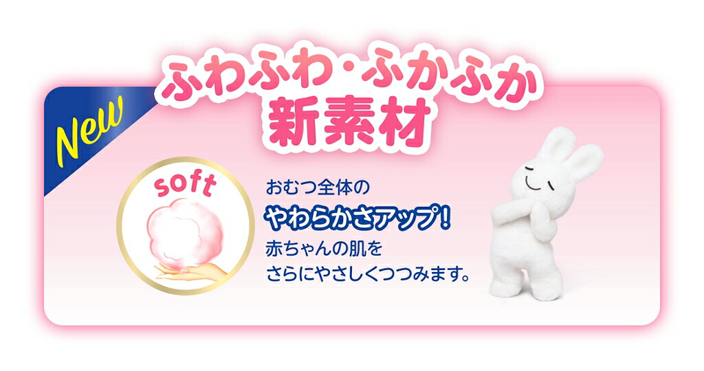 ふわふわ・ふかふか素材で、おむつ全体がやわらかく、赤ちゃんの肌をやさしくつつむ。