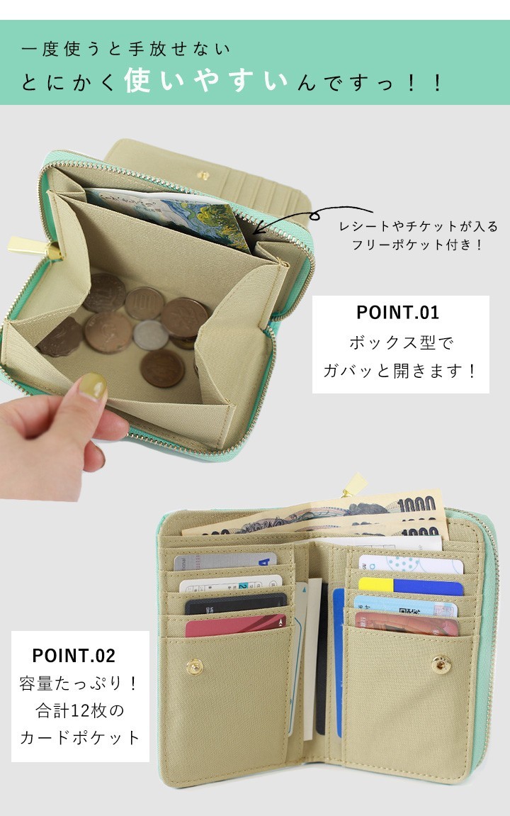 ラウンドファスナーで開く小銭入れは、ボックス型でガバっと開き、取り出しやすいのがポイント!