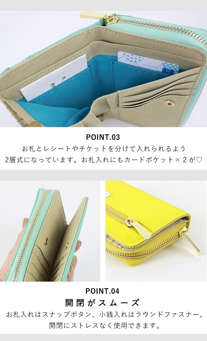 スナップボタンで大きく開閉する場所には、取り出しやすいカード収納、お札とレシートやチケット入れも完備!