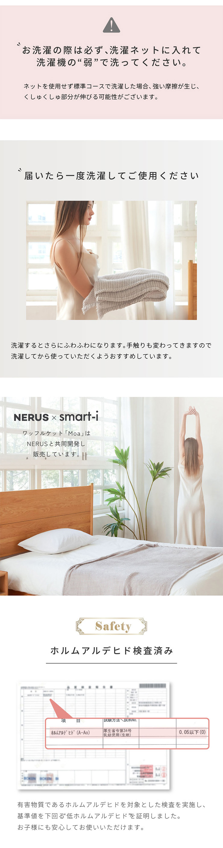 ※お洗濯の際は必ず、洗濯ネットに入れて洗濯機の【弱】で洗ってください。ネットを使用せず、標準コースで選択した場合、強い摩擦が生じ、生地が伸びる可能性がございます。