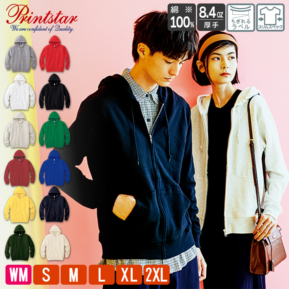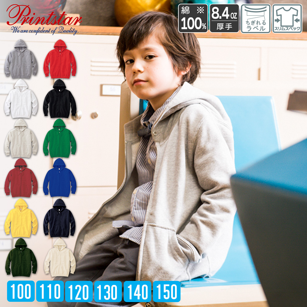 パーカー キッズ ジップアップ 無地 8.4オンス プリントスター Printstar 00217-MLZ 綿100% スウェット 薄手 子供用 男の子 女の子 白 黒 紺 グレー 100-150