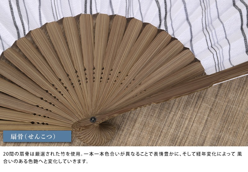 兵庫の「播州織」と、京都の「京扇子」。ふたつの伝統工芸品がコラボした、上質の扇子です。細くたなびく風のような「よろけ織」が清涼感抜群。スーツ姿にもマッチし、今や夏のビジネスマンの必須アイテムとなりつつある扇子。専用の袋と箱が付属するので贈り物としても最適です。