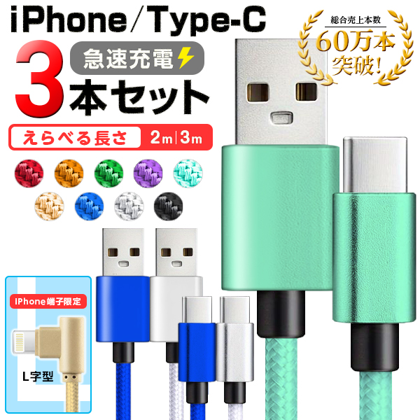 スマートフォンケーブル 充電 コード 急速充電 Type-c iPhone 充電ケーブル 3本セット