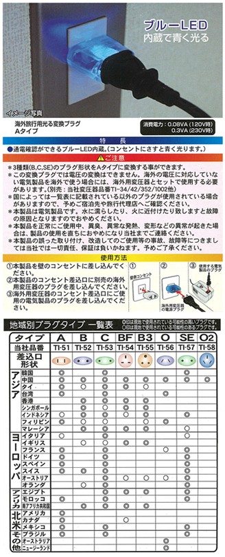 日本仕様(A)の電気製品を海外仕様に変換できる電源変換アダプター。通電確認ができるブルーLED内蔵、コンセントに差し込むと青く光ります。