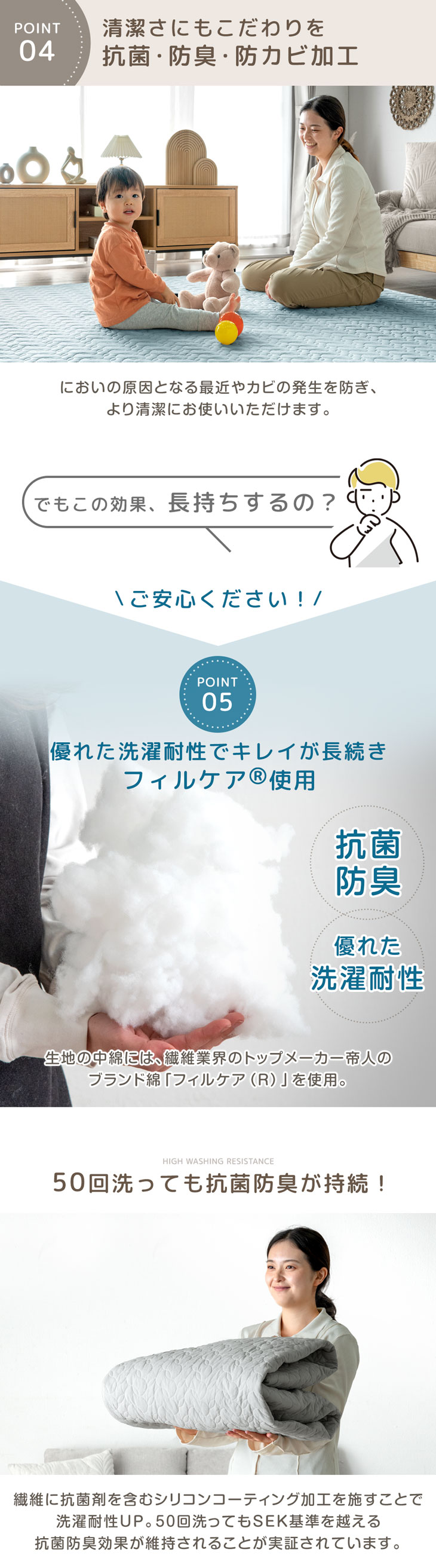 中綿:ポリエステル100%(抗菌防臭高機能わたfilcare50%使用)