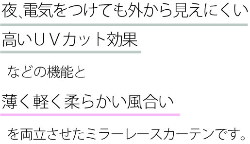夜も見えにくく、UVカット率も高い、機能性バツグンでありながら、生地が厚くならず、薄くて軽くてやわらかいレース本来の風合いがあります。紫外線はちゃんとカットしますが、可視光線はたっぷり通すので、お部屋の中は明るいままです。