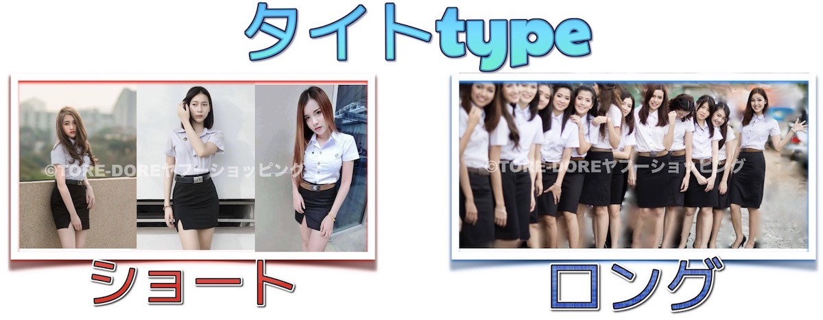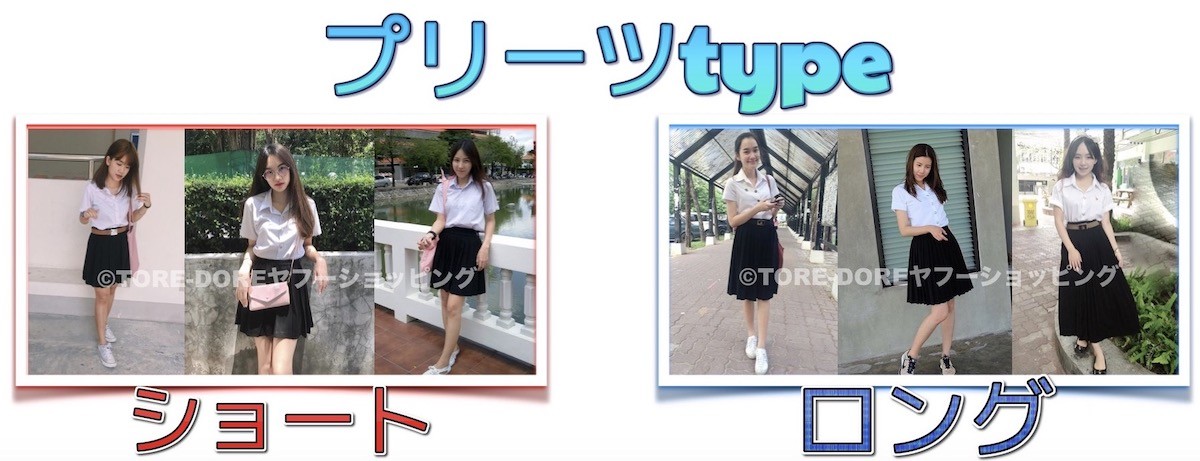 タイの女子大学生の制服スカートは4種類あります。いずれも王道の女子大生スタイルで人気のある4種の中からお選びいただけます。女子大生の制服は大きく分けてタイトtypeとプリーツtypeに分かれています。