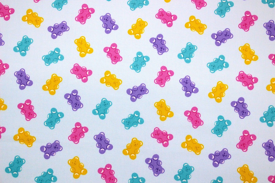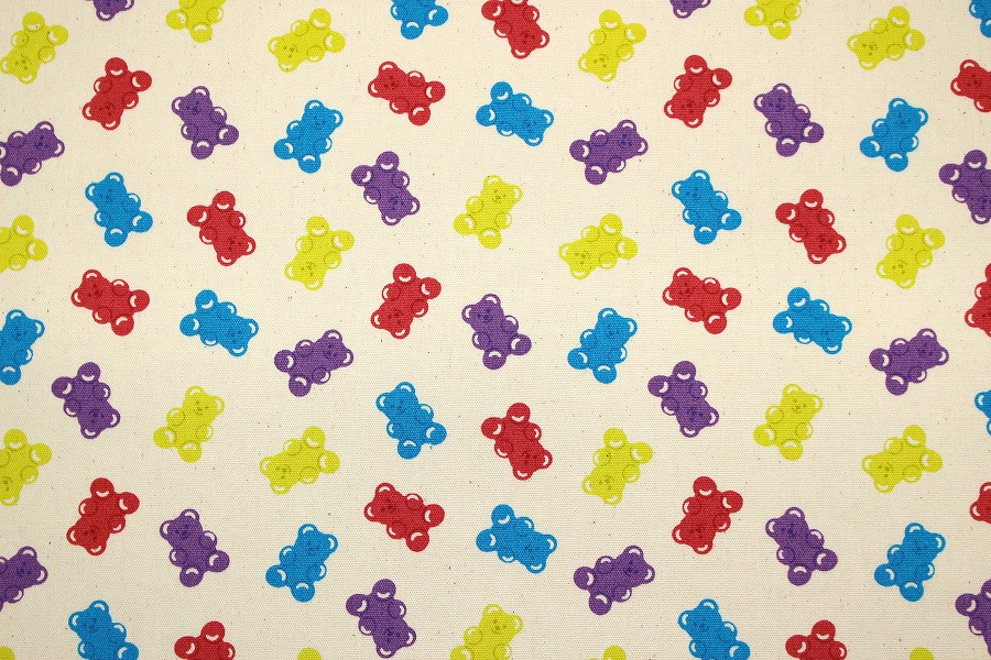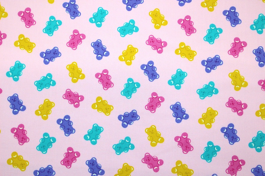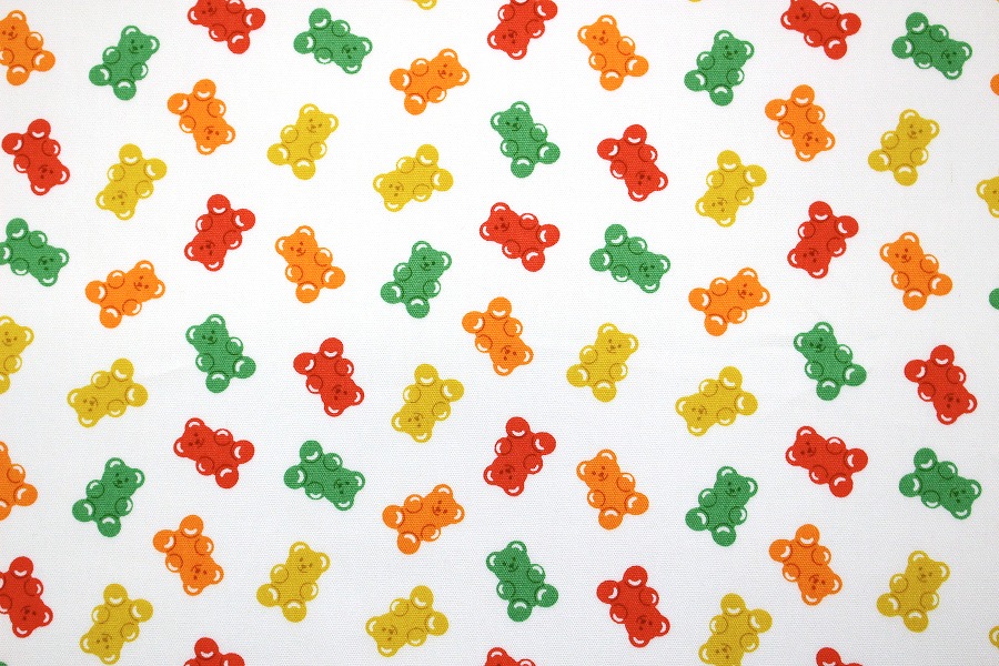 くまさんの形をしたカラフルなグミが描かれたポップでかわいい柄。