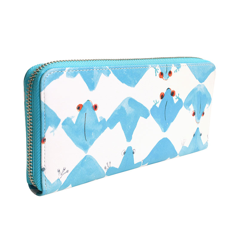 デザイナー ツモリさんがコスタリカに旅した時に見たカエルの群れがプリント柄になった長財布です。