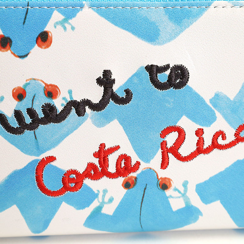 コスタリカで見たカエルの群れをプリント。ロゴは刺繍で立体感があります。
