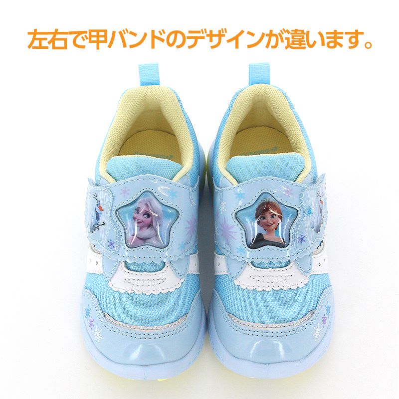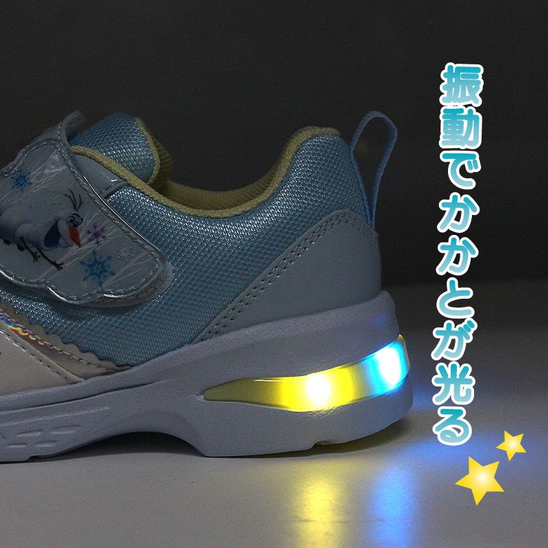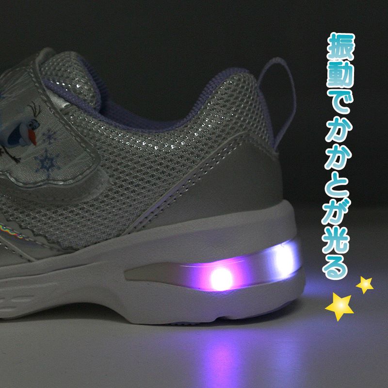 ディズニーアナと雪の女王のLEDシューズです。ワンタッチで脱ぎ履きできる一本バンドのジョグタイプです。通園をはじめ、外遊びや運動、お出かけなど、マルチに履いていただけます。左右で甲バンドのイラストが異なるデザインがポイント、アナ雪の白銀の世界を靴全体でイメージしたデザインです。振動によってソールの踵が光るので夜間での歩行の安全性を高めます。発光回数の目安は約30万回、およそ2か月光ります。中敷きには「Ag+抗菌防臭」を搭載しています。【Ag+抗菌防臭】銀イオンの抗菌作用でにおいのもととなる菌の増殖を抑制し、防臭効果を発揮します。