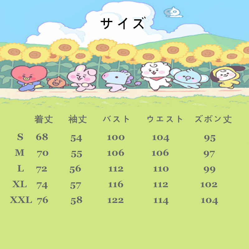 XXL:着丈76cm、袖丈58cm、バスト122cm、ウエスト114cm、ズボン丈104cm。