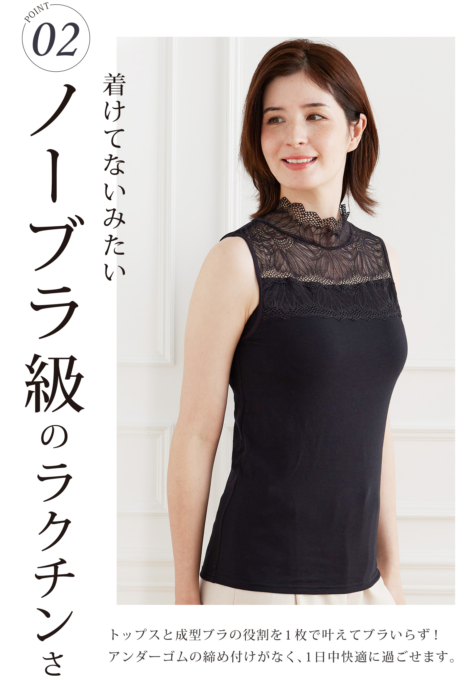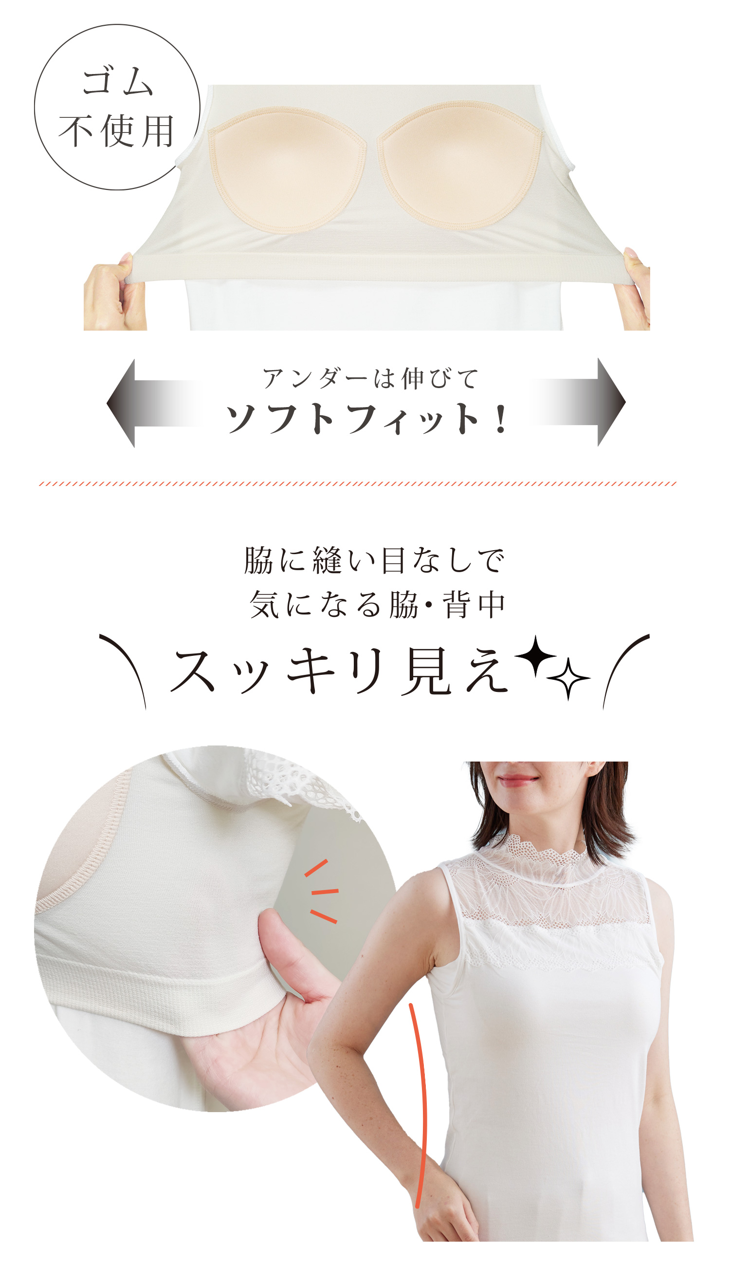 アンダーは幅広の編地変化で締め付け感がなく、長時間着用しても苦しくなりにくい。