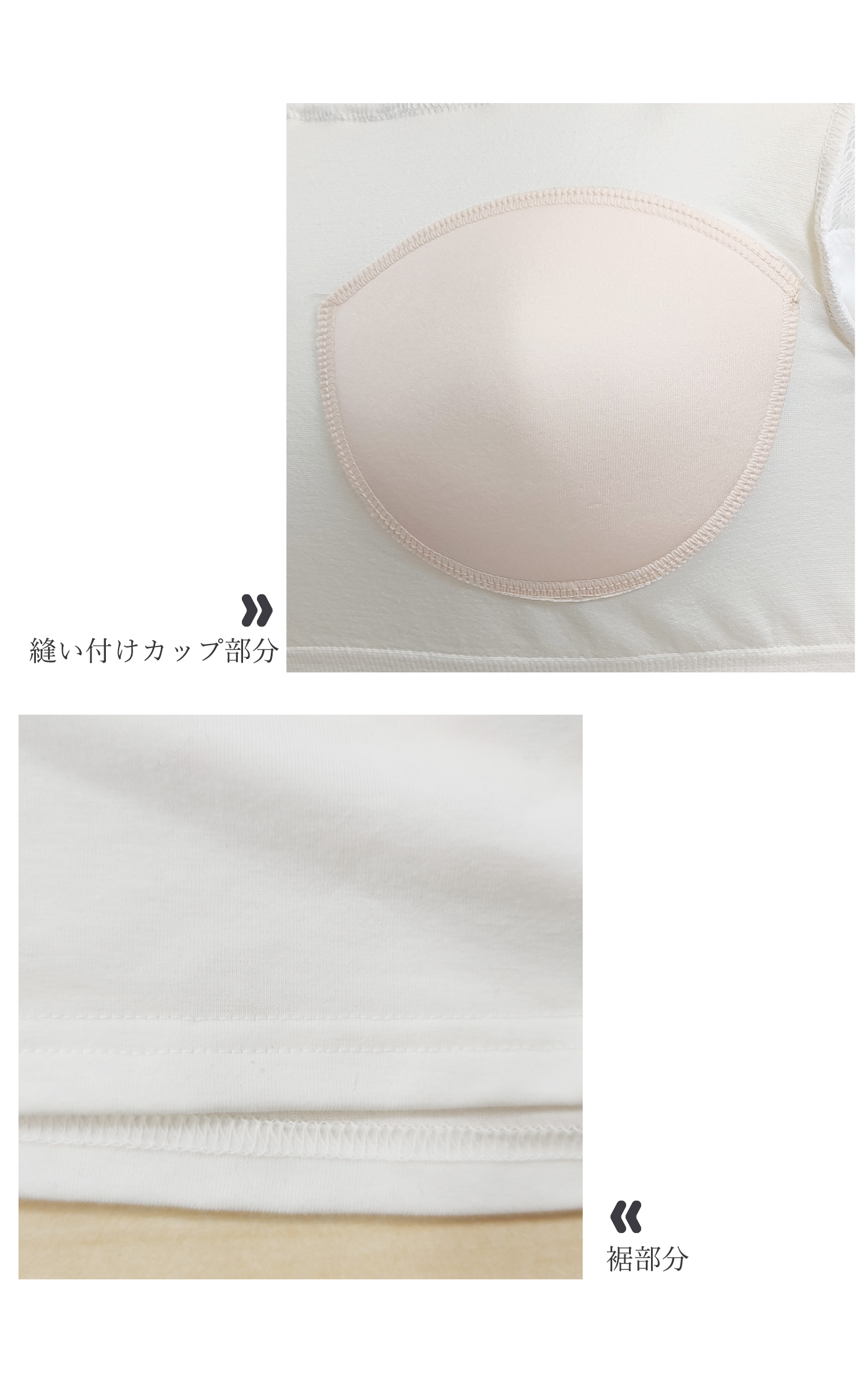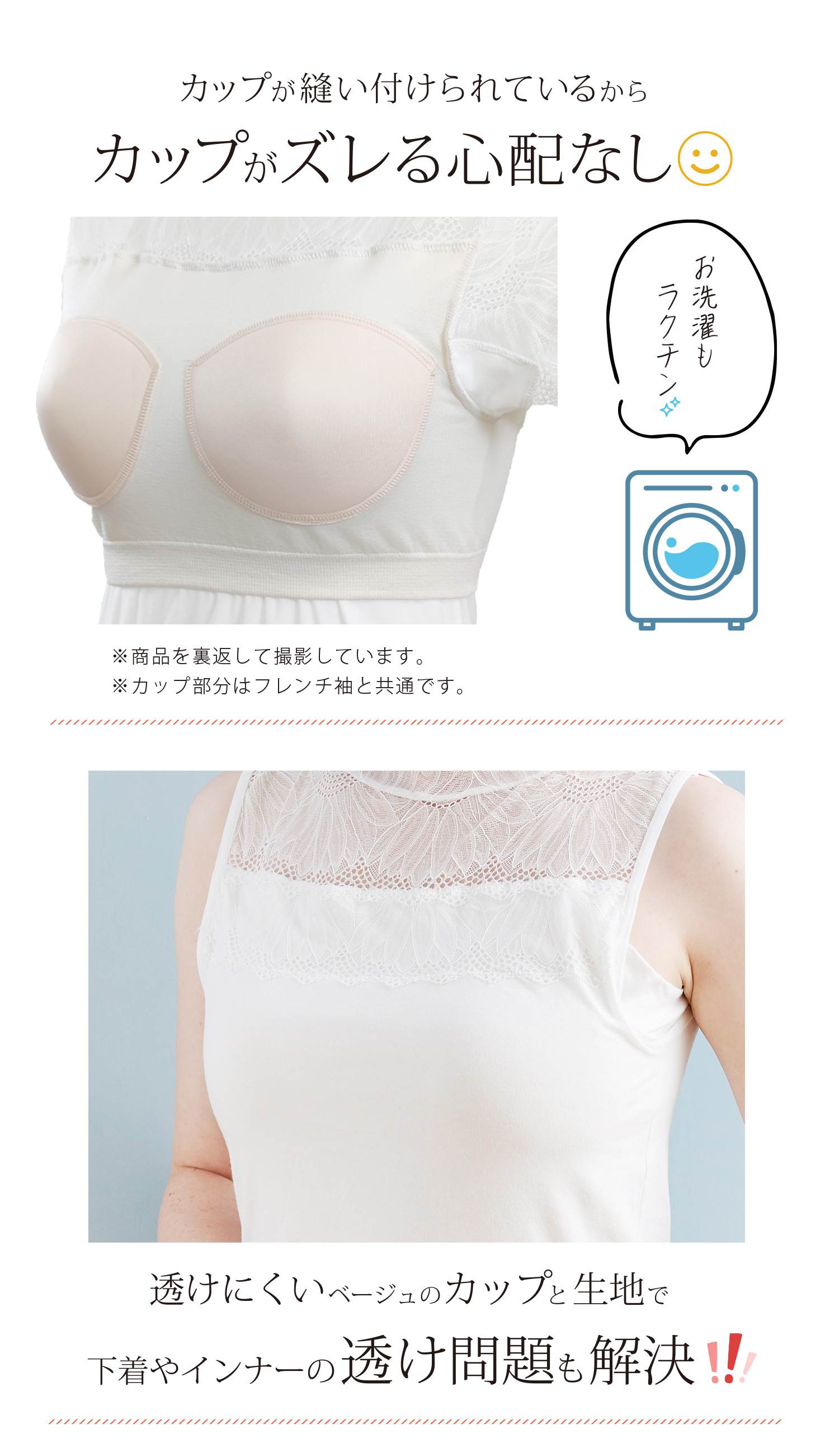 ・縫い付けカップでお洗濯してもズレません