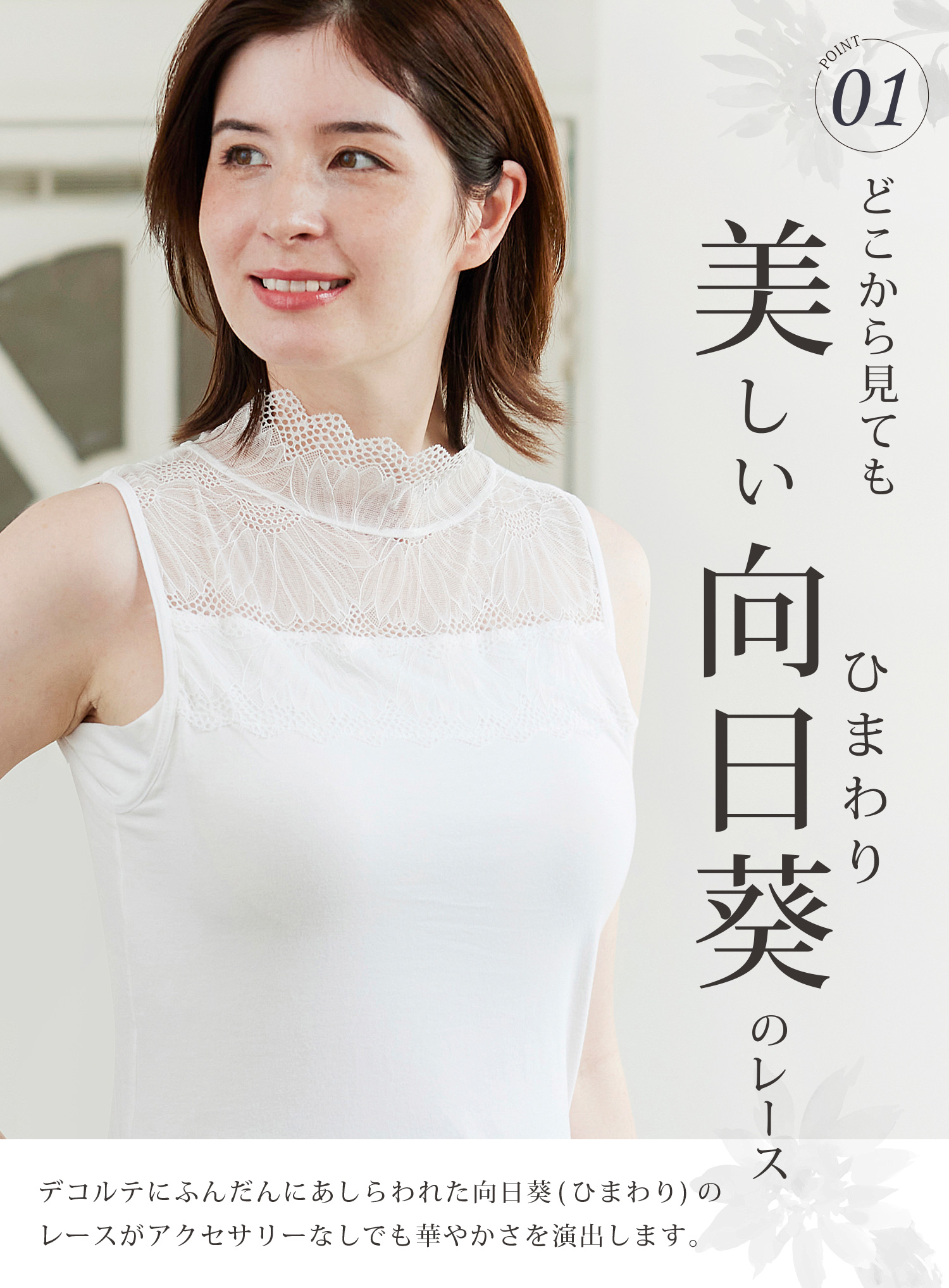 胸上のエレガントなレース使いで顔まわり華やか。
