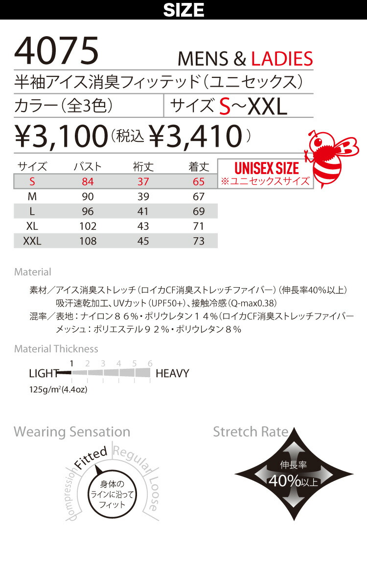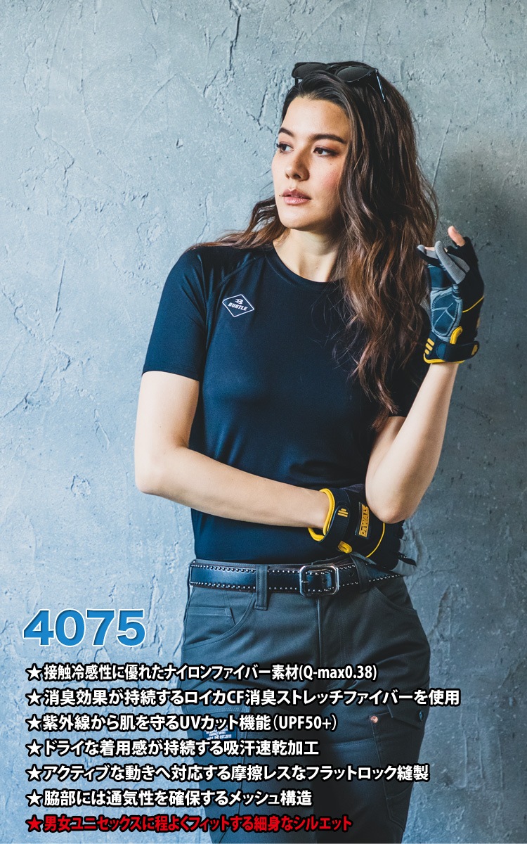 BURTLE アイス消臭フィテッド 4075 M〜XXL 半袖 インナー メンズ レディース 接触冷感 吸汗速乾 バートル 作業服 作業着 コンプレッション 春夏