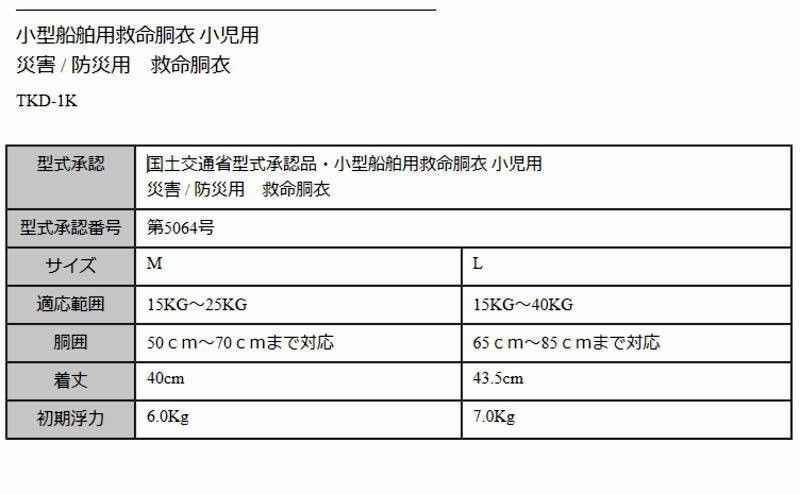カラー:Color / オレンジ型番:TKD-1K型式承認国土交通省型式承認品・小型船舶用救命胴衣 小児用災害 / 防災用 救命胴衣型式承認番号第5064号サイズM・・・適応範囲15KG〜25KG/胴囲50cm〜70cmまで対応/着丈40cm/初期浮力6.0KgL・・・適応範囲15KG〜40KG/胴囲65cm〜85cmまで対応/着丈43.5cm/初期浮力7.0Kg※ライフジャケットは保険です。正しく着用して安全にレジャーをお楽しみ下さい2018/04/13国土交通省型式承認品/子ども用フローティングベストTKD-1K 高階救命器具/小型船舶用救命胴衣/国交省認定品/桜マーク/こども用・マリンスポーツ・ジュニア ライフジャケット・救命胴衣・キッズ・防災・マリンスポーツ・スノーケリング