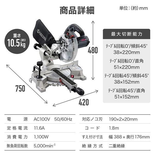 付属品:190mmチップソー、集じん袋、スパナ、締付ハンドル、クランプ