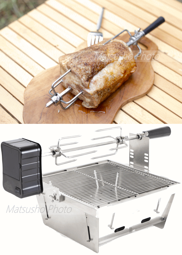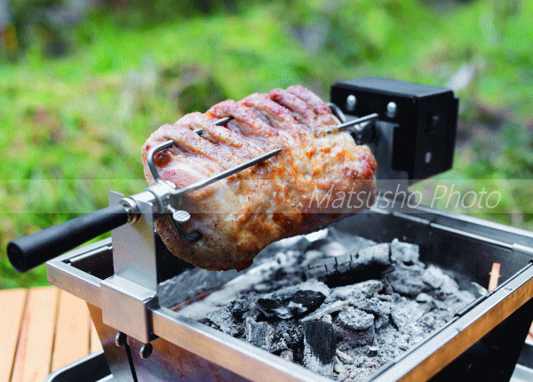 パーフェクトグリルに設置して肉をはじめ魚・果物などをくるくる回してワンランク上のバーベキューを。