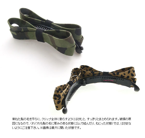 ご注意▼※束ねた髪の毛を平らに、クリップ全体に散らすようにはさむと、すっきりとまとめられます。破損の原因になりますので、くれぐれも髪の毛に厚みのある状態(ゴムで結んだり、ねじった状態)では、はさまないようにご注意下さい。接着が剥がれる原因となりますので、海やプールなどでのご使用はお止めください。また、高温多湿のところでの保管は避けて頂きますようお願いいたします。