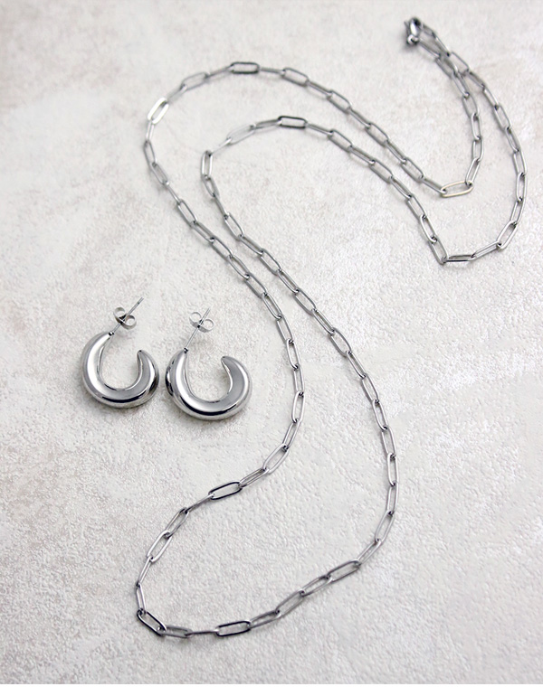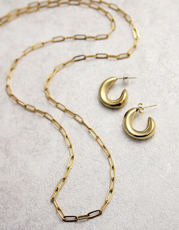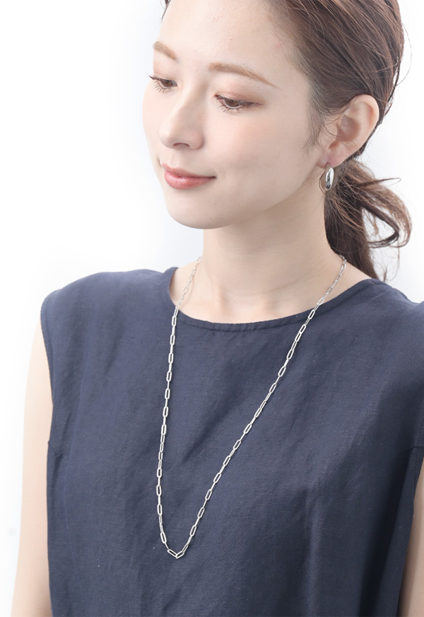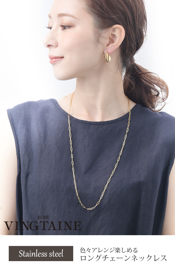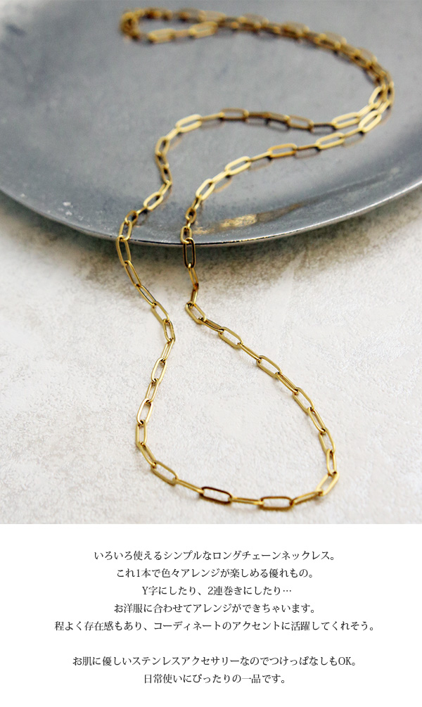 いろいろ使えるシンプルなロングチェーンネックレス。これ1本で色々アレンジが楽しめる優れもの。Y字にしたり、2連巻きにしたり…お洋服に合わせてアレンジができちゃいます。程よく存在感もあり、コーディネートのアクセントに活躍してくれそう。お肌に優しいステンレスアクセサリーなのでつけっぱなしもOK。日常使いにぴったりの一品です。