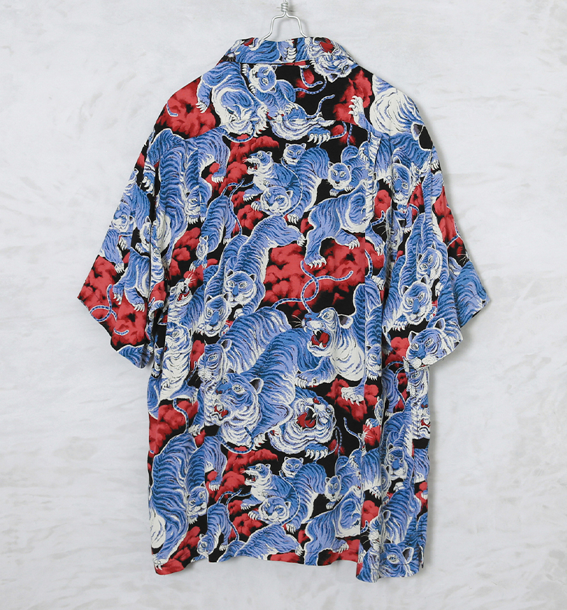 シャツ全面にそれぞれ表情や動きが違う虎のプリントはインパクトがあり、その細部は魅入ってしまうほどに非常に細かく繊細なデザイン。