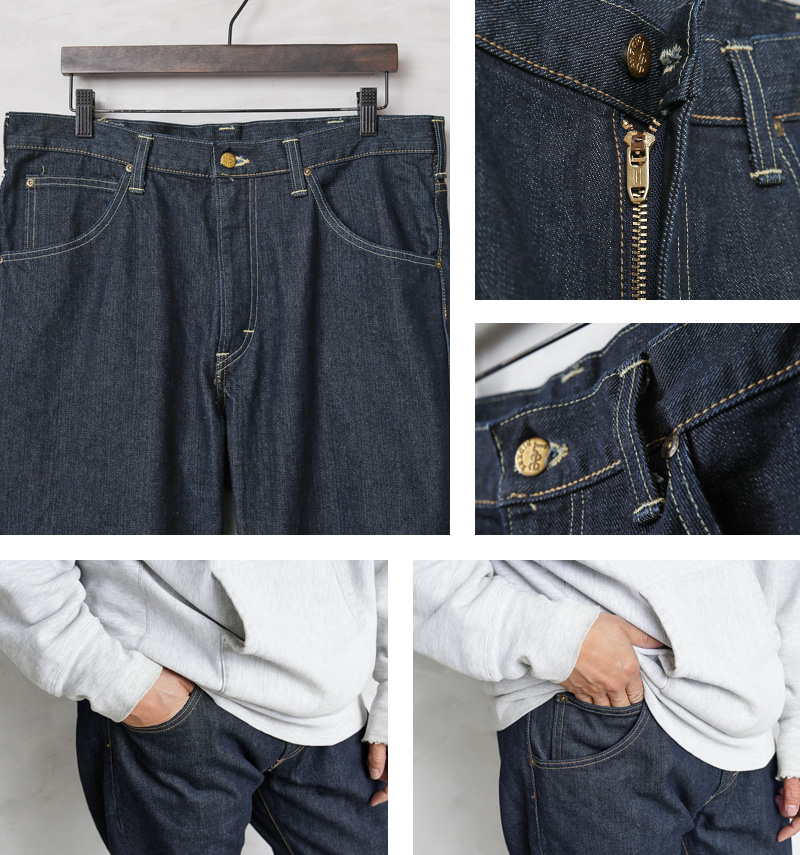 ゆとりのある腰回りから膝、そして裾へと一気にシェイプを利かせたテーパードシルエットで、30インチからはベルトループを5本から7本にする事でウエストのホールド感をアップさせています。