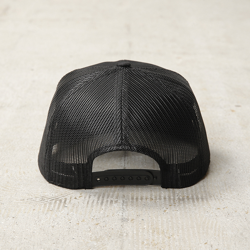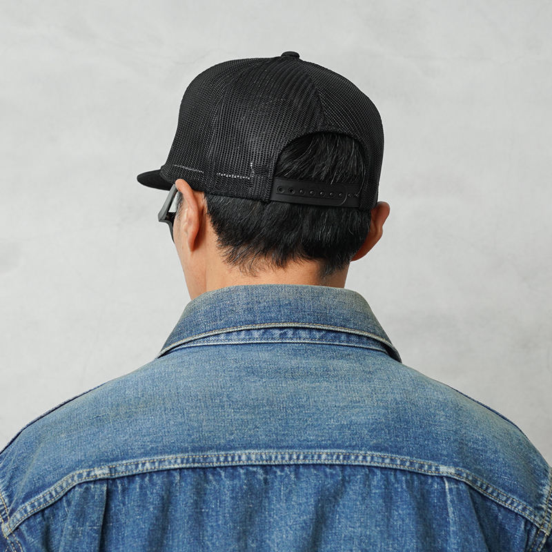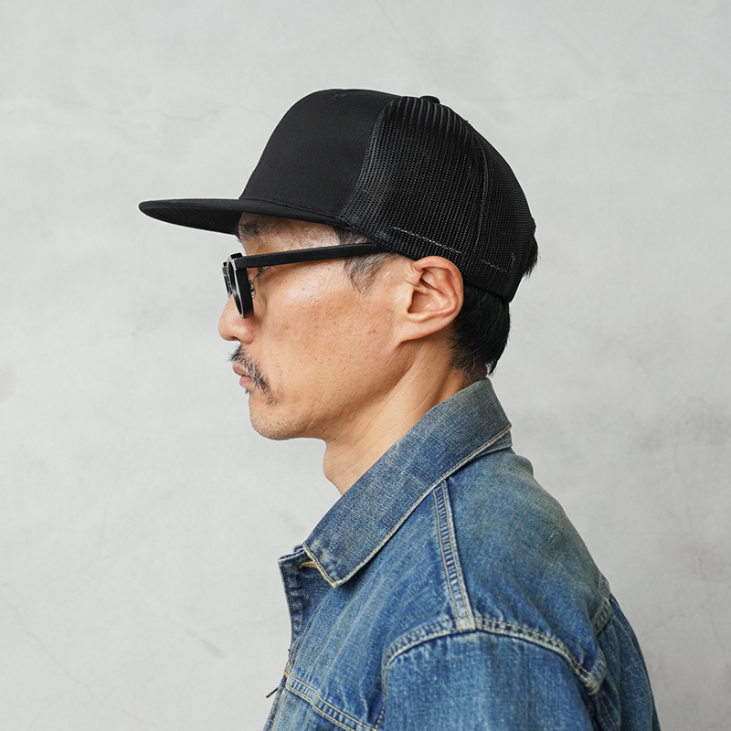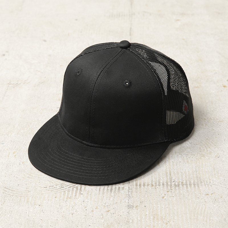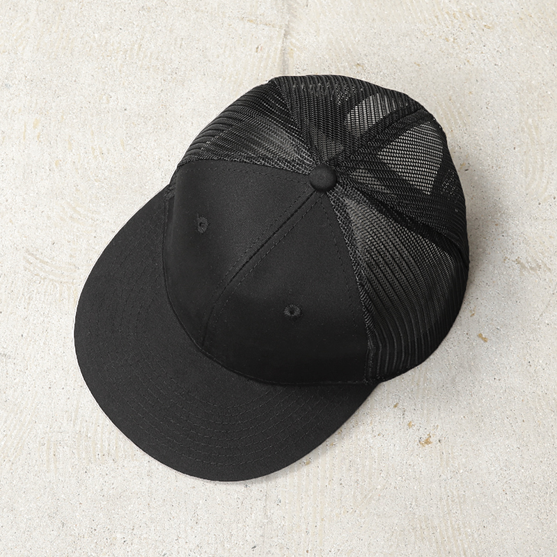 5パネルのメッシュキャップで、ロゴや文字のないシンプルさとBLACKカラーが使いやすい一品です。