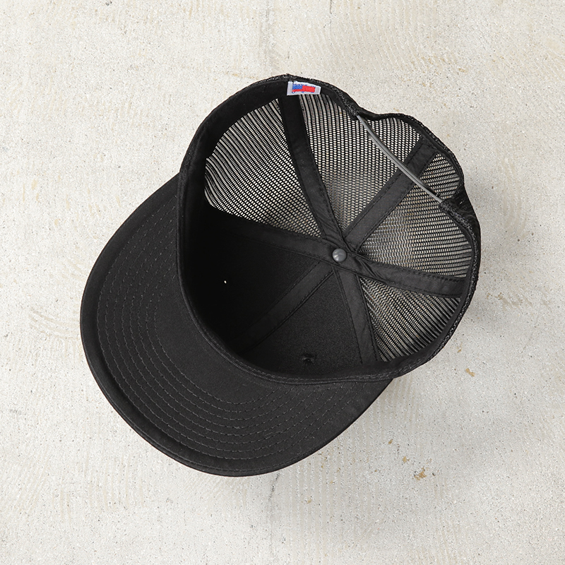 レトロ感のあるスナップバックデザイン。しっかりとしたコットン生地のフロントに同色のメッシュ素材で出来ており、キャップ内側には汗止めのライナー付き。タグもメーカーなどの記載はなくアメリカ製品を強調する「MADE IN U.S.A.」のマークのみというシンプルさ。