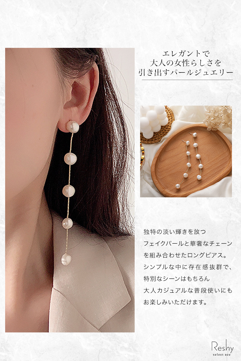 独特の淡い輝きを放つフェイクパールと華奢なチェーンを組み合わせたロングピアス。