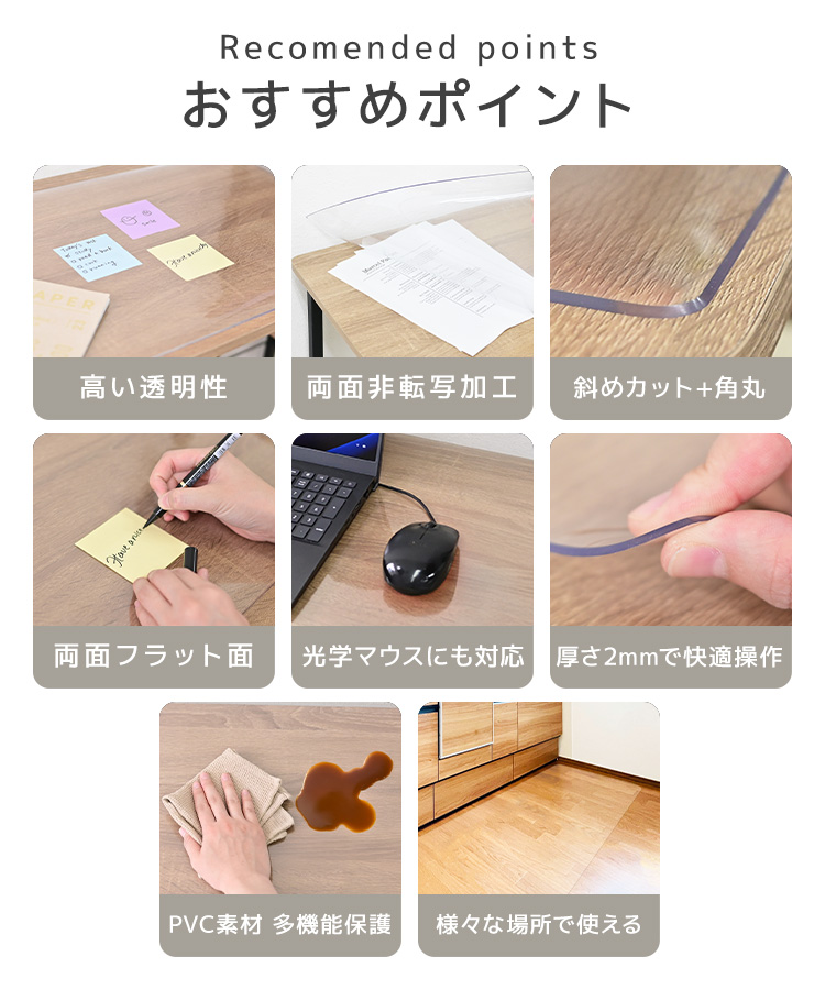 デスクマット 透明 学習机 選べる10サイズ 80×40 クリアマット 厚さ2mm 光学マウス対応 抗菌 防カビ 防水 デスク 下敷き オフィス テーブルマット 傷防止