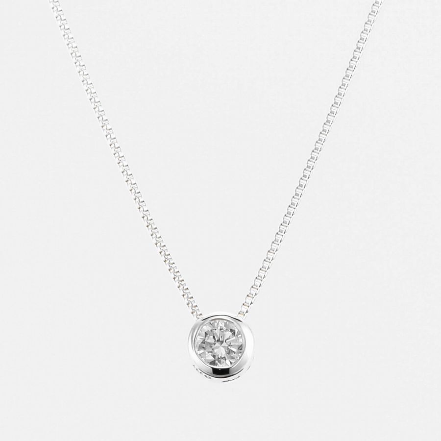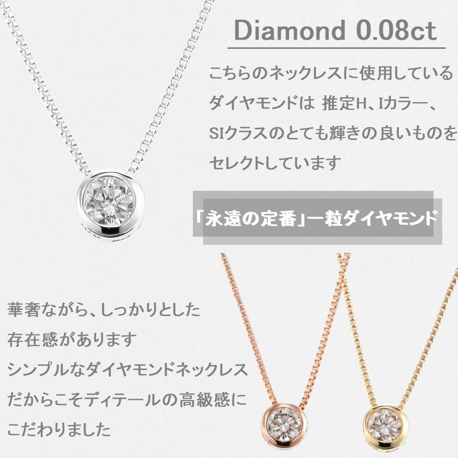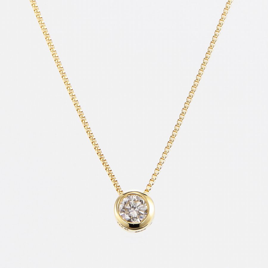 」「永遠の定番」一粒ダイヤモンドネックレスは、輝き・品質・カラー、そしてお値段にもこだわって欲しいものです。余分な装飾のない、定番ふせ込みタイプのデザインが、ダイヤモンド本来の輝きを引き立てています。