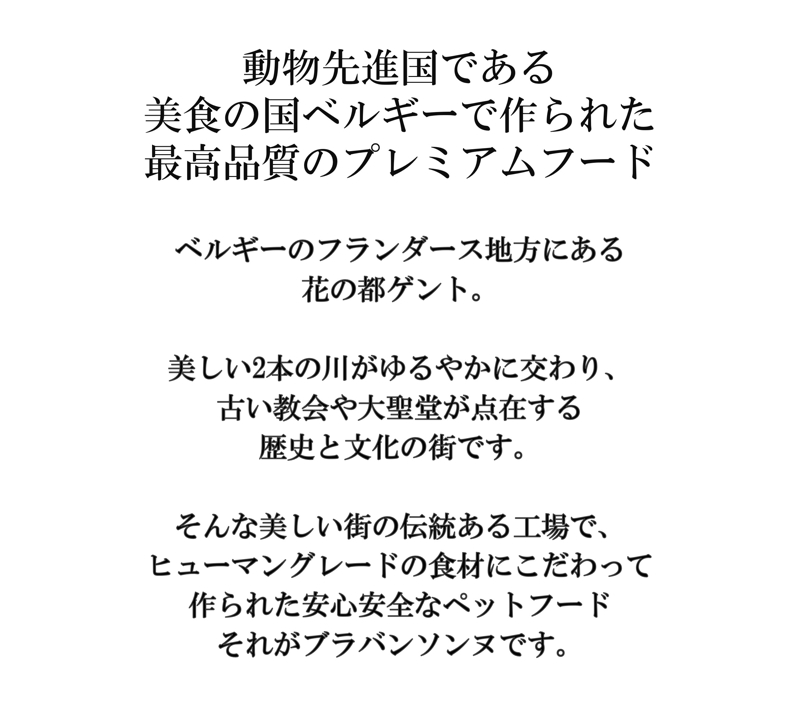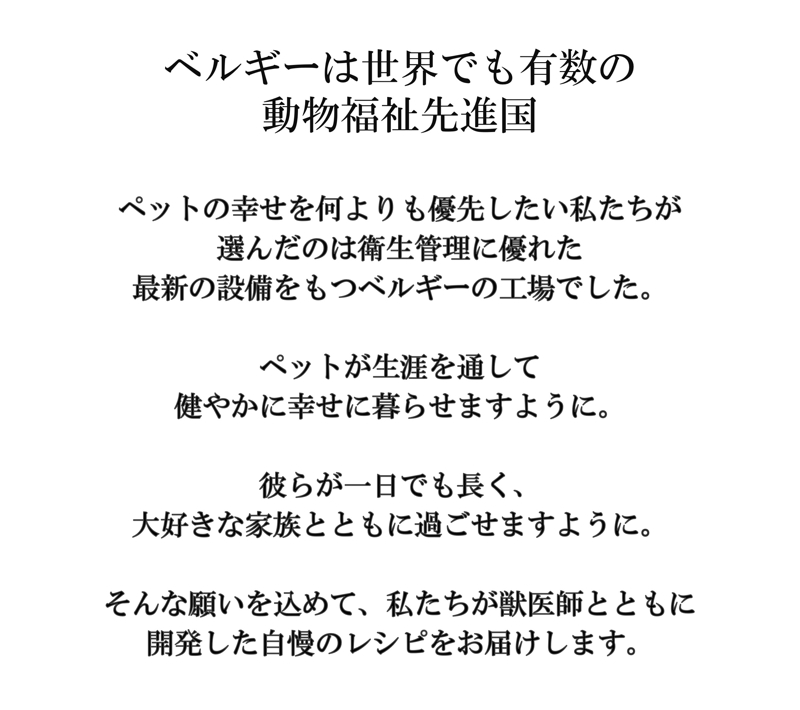 その理由は、フードの品質と安全性にこだわったためです。ペットフードの品質と安全性は製造工場の衛生面に大きく依存します。食事は大切なペットの命の源になるもの。私たちは工場の衛生環境にも一切妥協することなく、いくつもの工場を回って調査を重ね、高度な衛生環境を保っているベルギーの工場での製造を決めました。