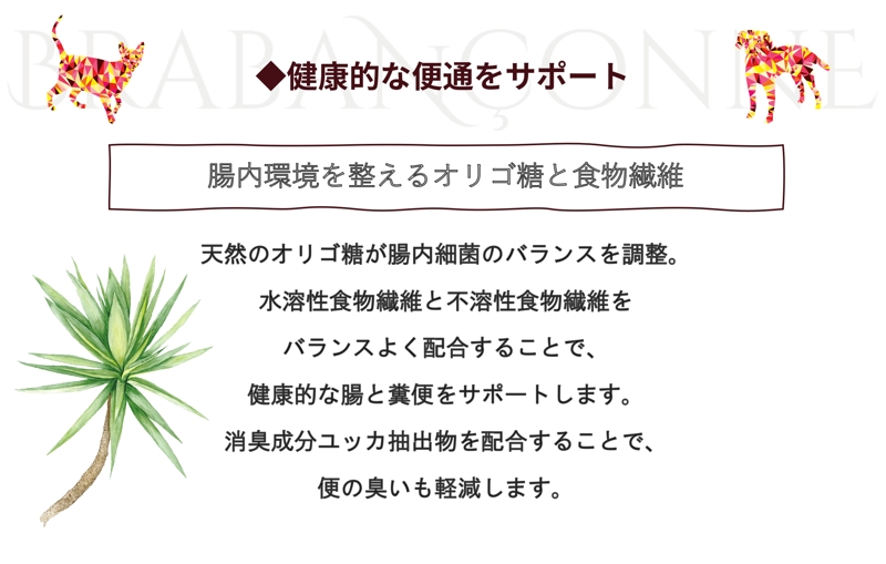粗タンパク質 30%以上、粗脂肪 20%以上、粗灰分 8%以下、粗繊維 3%以下、水分 8%以下、オメガ6 脂肪酸3.26% 以上、オメガ3 脂肪酸0.8% 以上、カルシウム1.7%、リン0.9% 以上、カリウム0.6%、ナトリウム0.2%、マグネシウム0.1%