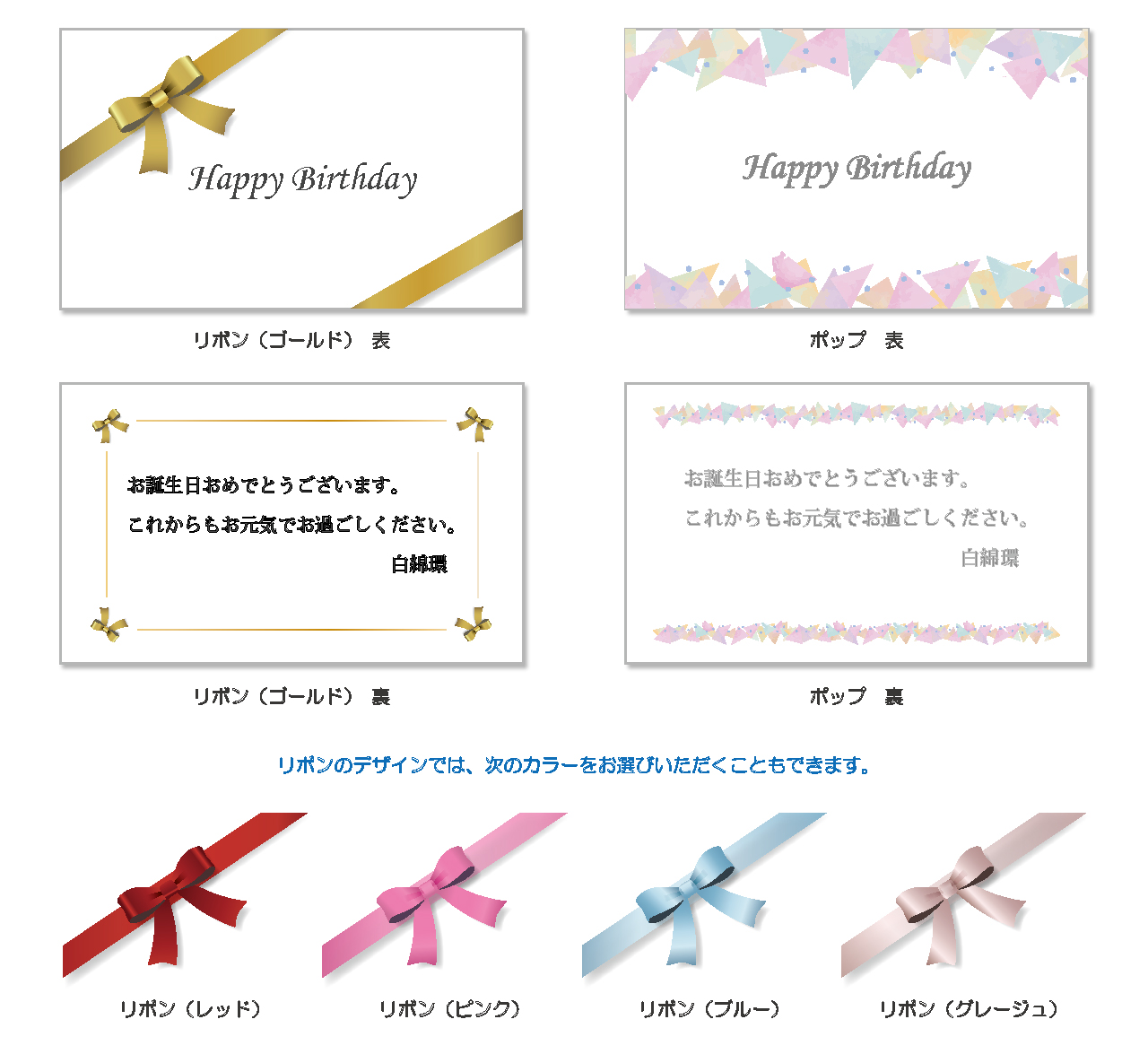 ○ メッセージカードのデザインは、リボンとポップの2種類となります。リボンデザインの場合は、5つのリボンカラーの中からご希望のものをお選び下さい。