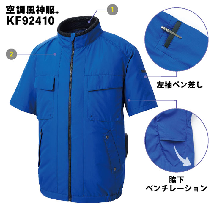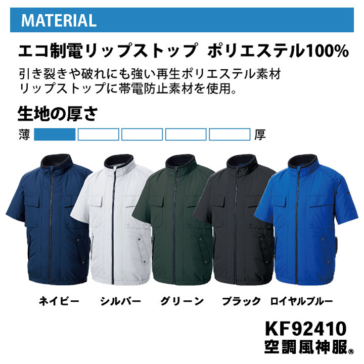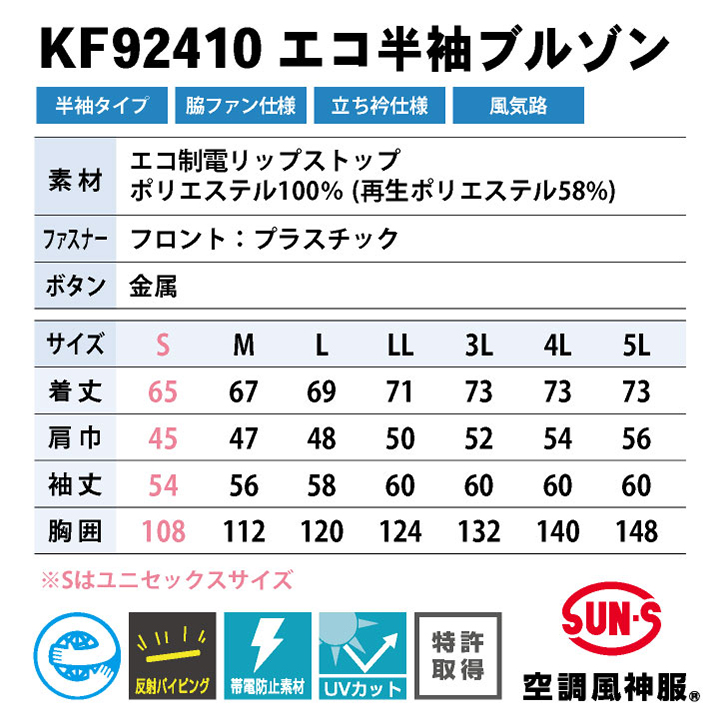 KF92410 SUN-S エコ半袖ブルゾン 引き裂きや破れにも強い再生ポリエステル素材リップストップに帯電防止素材を使用。 熱中症対策に適した空調風神服。 ・モニターにより実際の色と多少ちがって見えることがあります。人気商品のため、商品在庫が欠品することがあります。