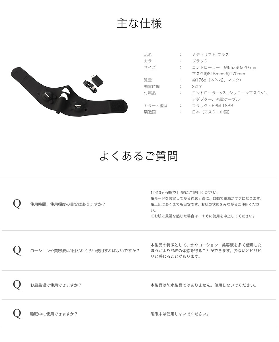 ・メディリフト プラス:本体、シリコーンマスク、充電用USBケーブル(マグネット式)、ACアダプター