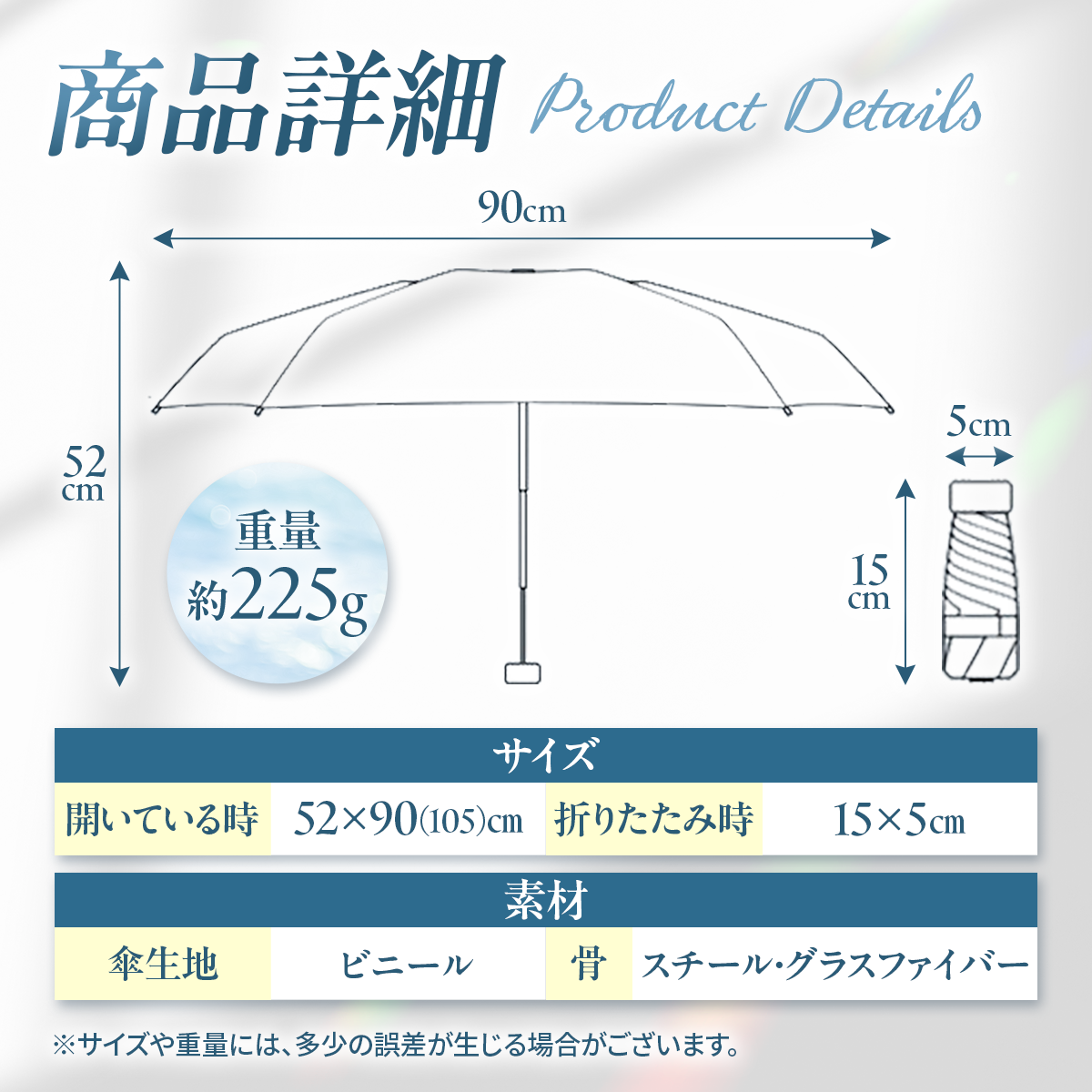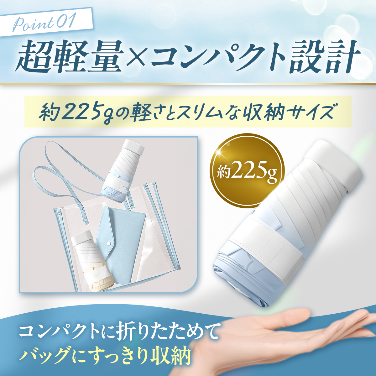 わずか約225g。毎日持ち歩ける超軽量折りたたみ傘