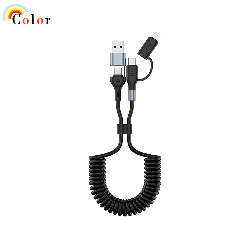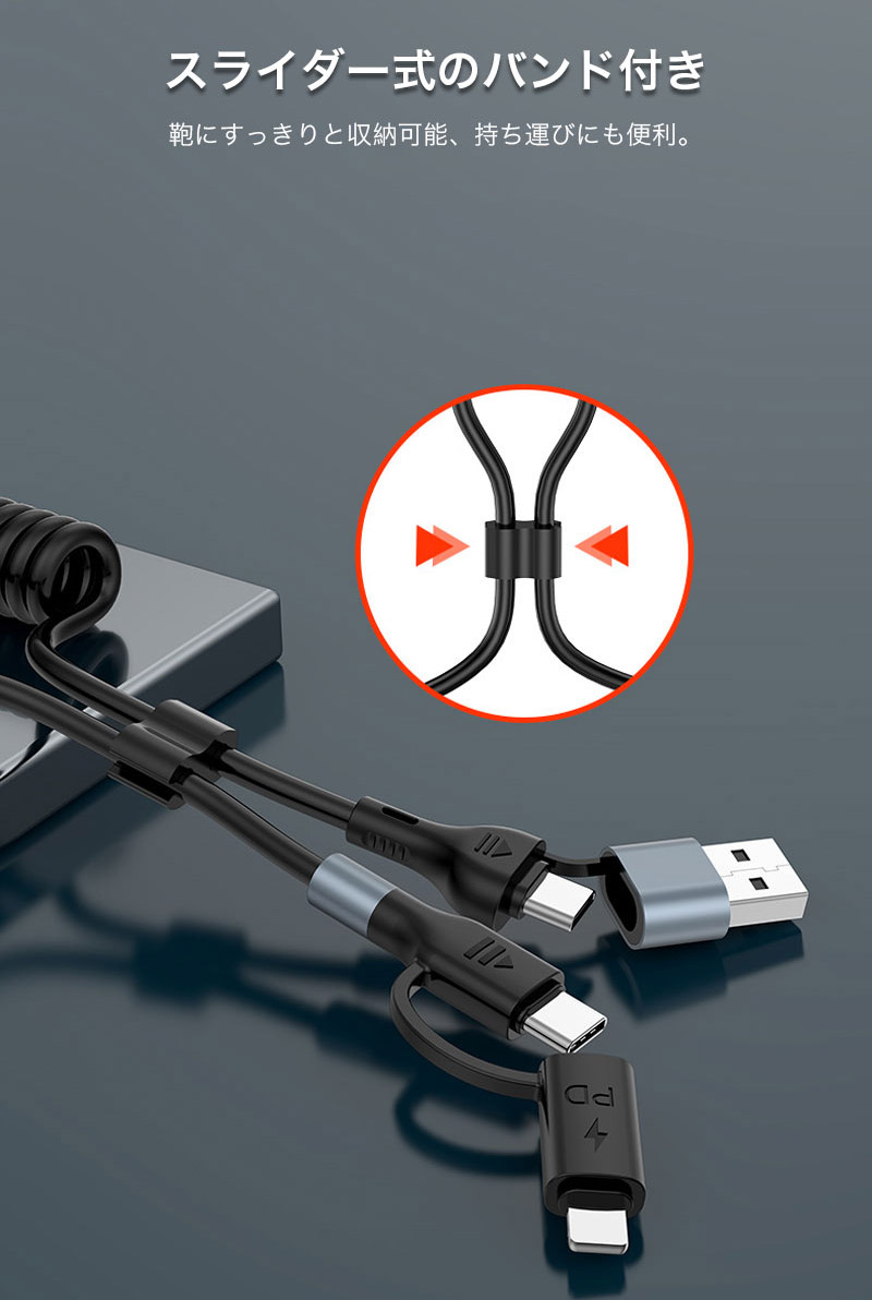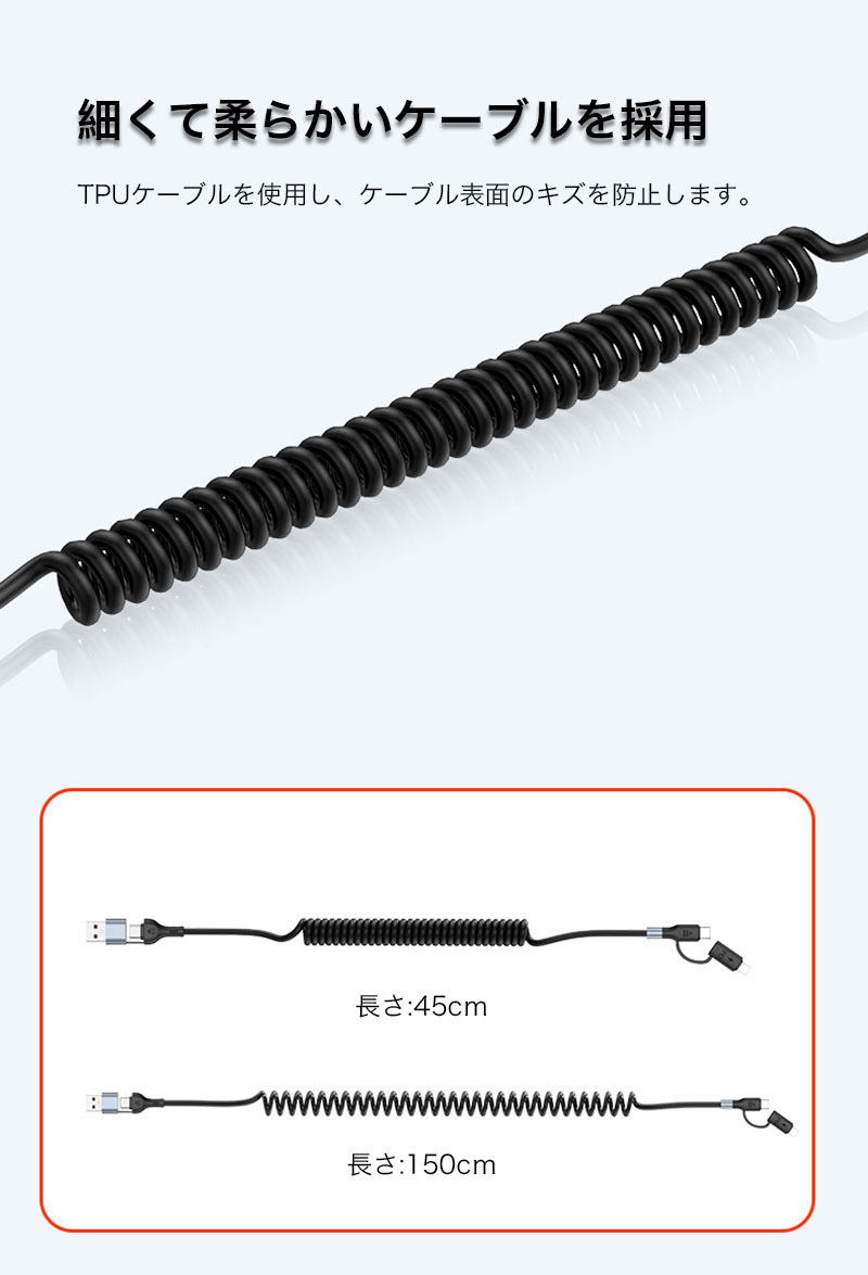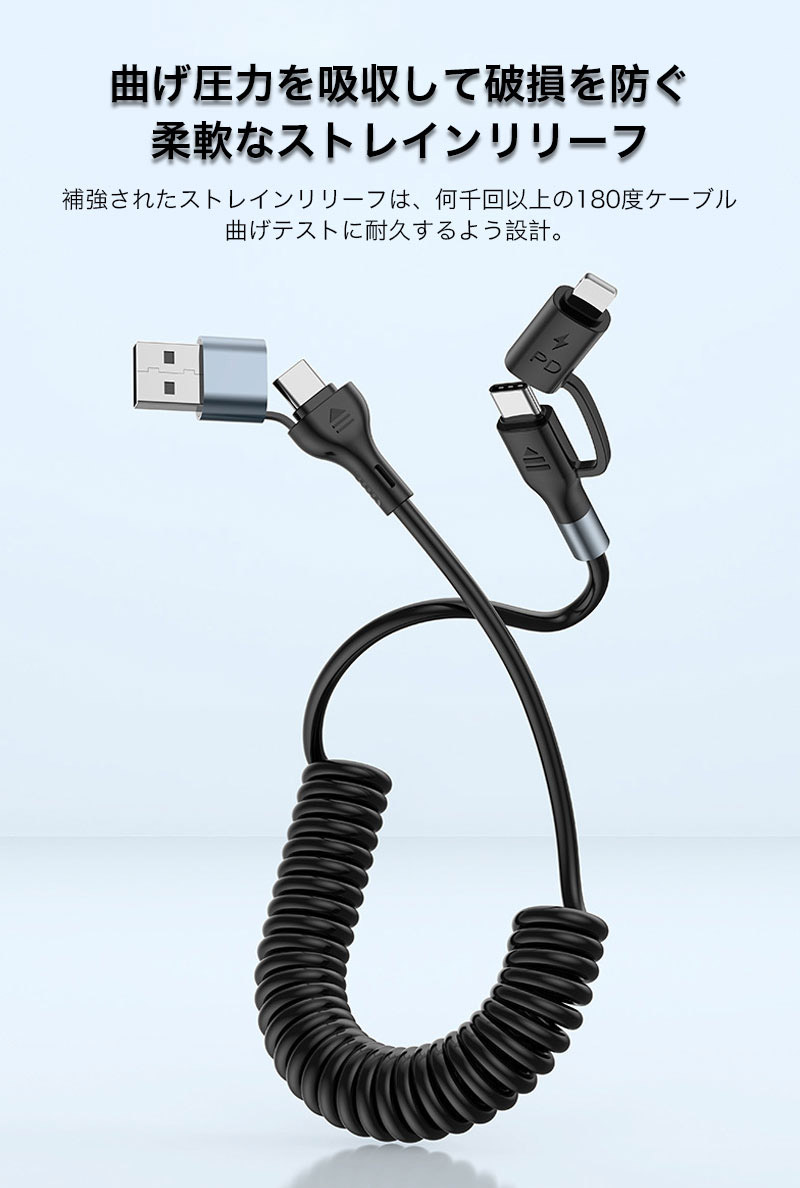 Type-C 充電ケーブル iPhone 17 16 15 iPad Android usb ケーブル 4in1 急速充電 tpyec ケーブル PD60W 1.5m カールタイプ 伸縮 iOS Galaxy Pixel 多機種対応