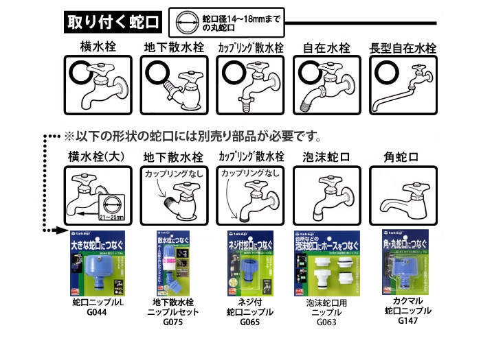 蛇口径14〜18mmまでの丸蛇口に取り付けできます。角蛇口や泡沫蛇口には別売り部品が必要です。