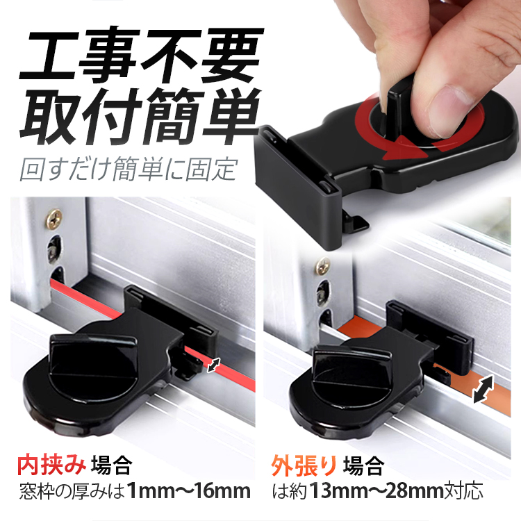 対応枠幅:内挟みと外張り2Way 内挟みは窓枠の厚さを1mm〜16mm、外張りは約13mm〜28 mm