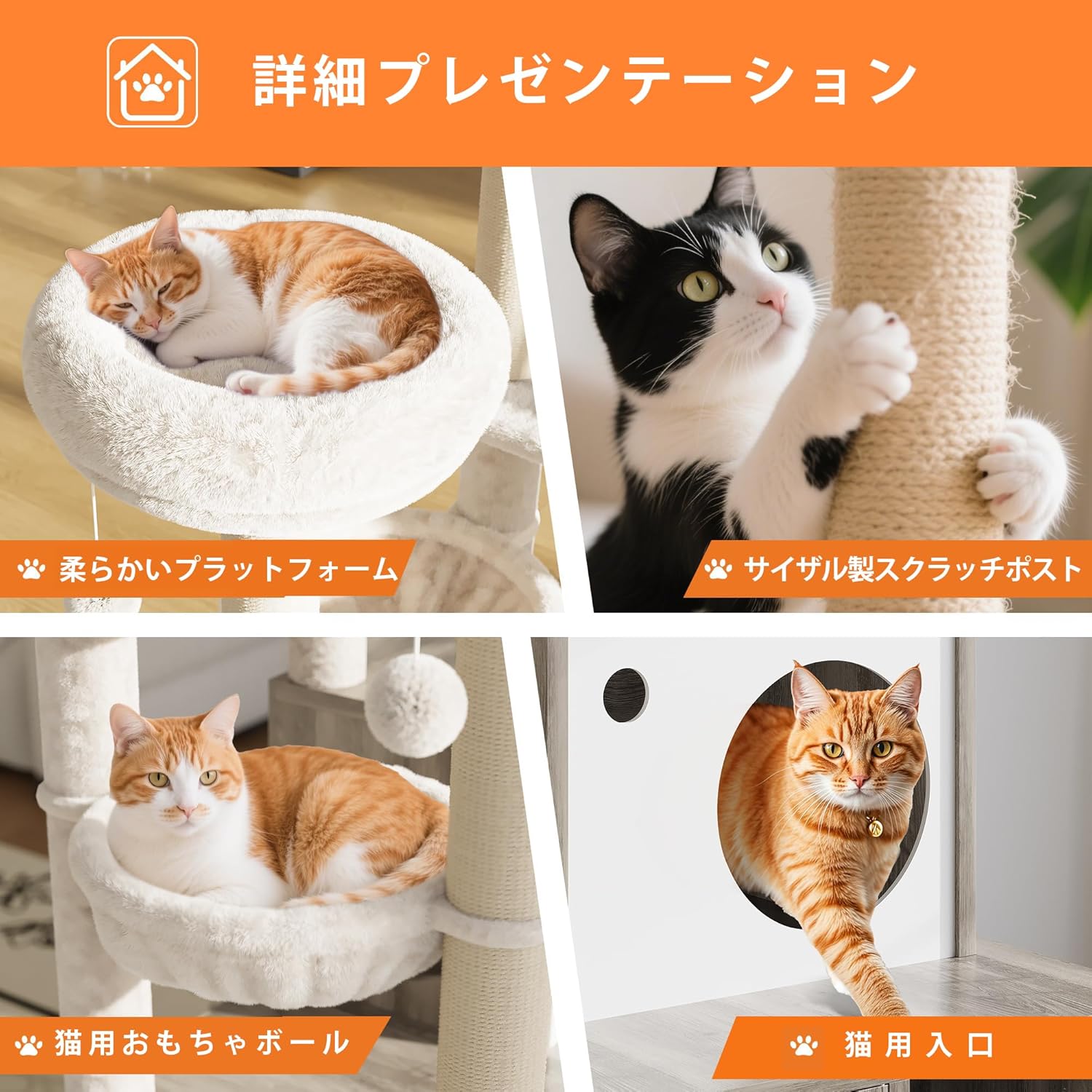 【遊び・休憩・トイレが一体】猫ハウス、ハンモック、やわらかいステップ、麻縄ポール、猫じゃらし、トイレ収納キャビネットを備え、多段構造で愛猫の興味を引きつけます。