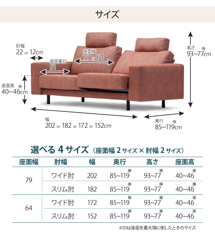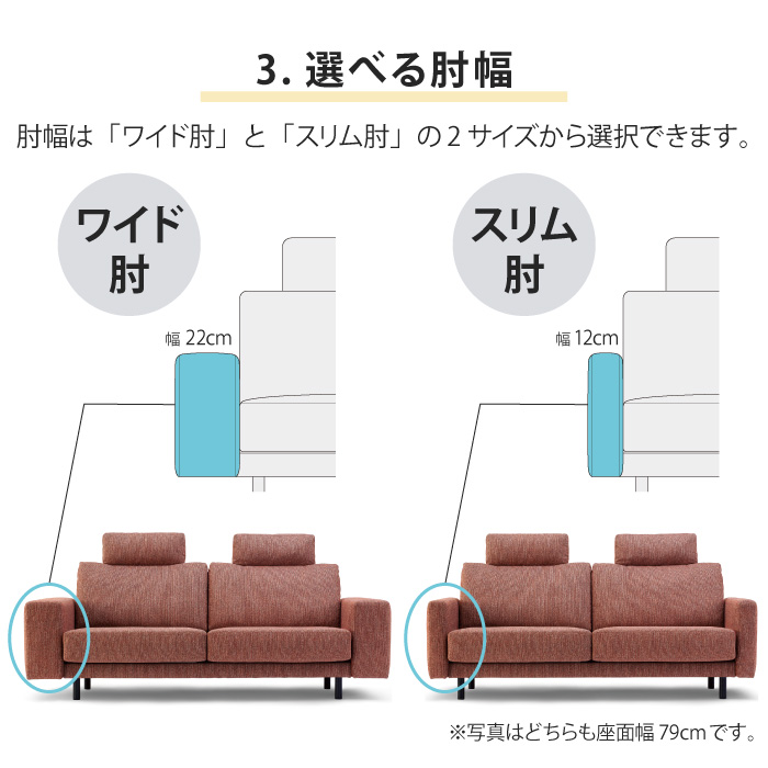 座面の幅は「幅79cm」「幅64cm」の2サイズ、肘幅は「ワイド肘」「スリム肘」の2サイズから選べます。