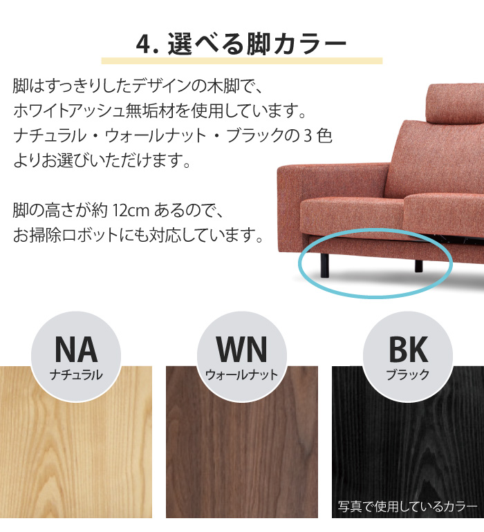 ・脚は木脚(ホワイトアッシュ無垢材)で「NA(ナチュラル)」「WN(ウォールナット)」「BK(ブラック)」の3色から選べます。
