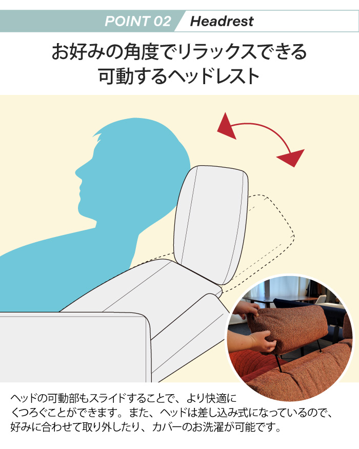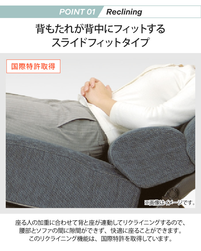 背もたれが人の背中にフィットしたままスライドする、スライドフィットタイプです。座面や背もたれだけでなく、ヘッドの可動部もスライドすることでより快適にくつろぐことができます。このリクライニング機能は、国際特許を取得しています。